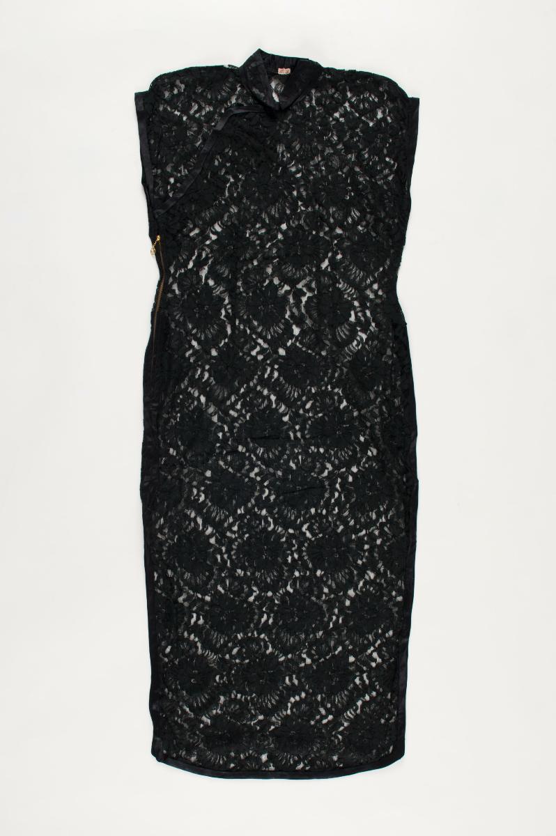 This is a black sleeveless cheongsam with cut-out floral designs. The collar is lined with a plastic support. It is figure hugging and tapered at the bottom, giving the wearer a pencil-slim silhouette. The flap on the right-hand side is secured by press studs.This cheongsam belonged to Mdm. Wu Chuen Chuen, who enjoyed wearing it to work and parties, often with a corset underneath to achieve the desired hourglass figure. A leading businesswoman of her time, Mdm. Wu ran the former Stamford Café at Bras Basah Road for 30 years before it closed in the 1970s.
