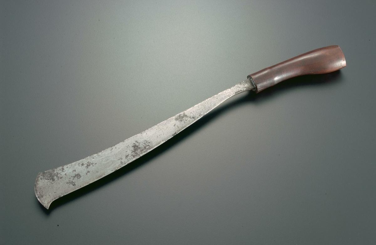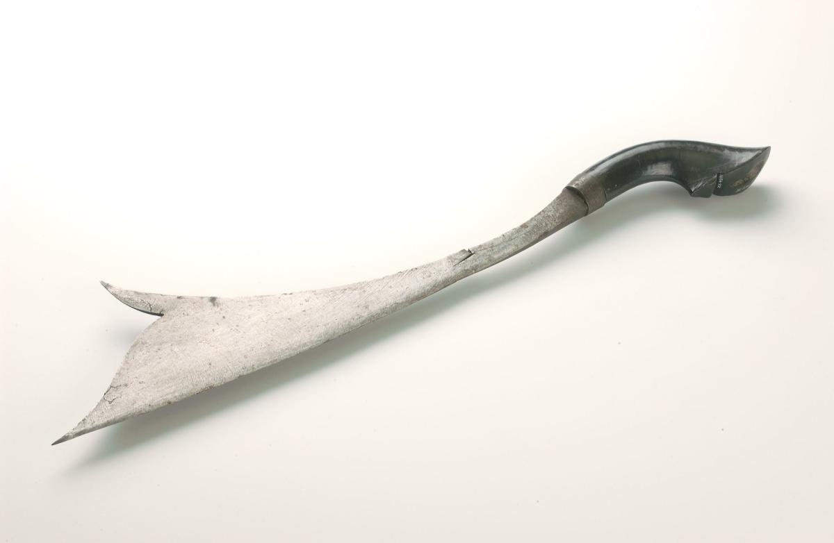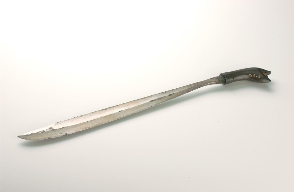 Mandau are straight-edged swords that were used by Dayak warriors in warfare. Many Dayak groups had mandau hilts carved out of the antlers or bones of the ‘rusa’ (sambur deer), or out of hardwoods. Precious items such as mandau, mandau hilts and scabbards were trophies of war and highly prized by Dayak warriors. They were often richly decorated with fur, feathers and talismans to protect the warriors who used them. The origins of most mandaus in the possession of a Dayak group are ambiguous as they were often raided from other groups.