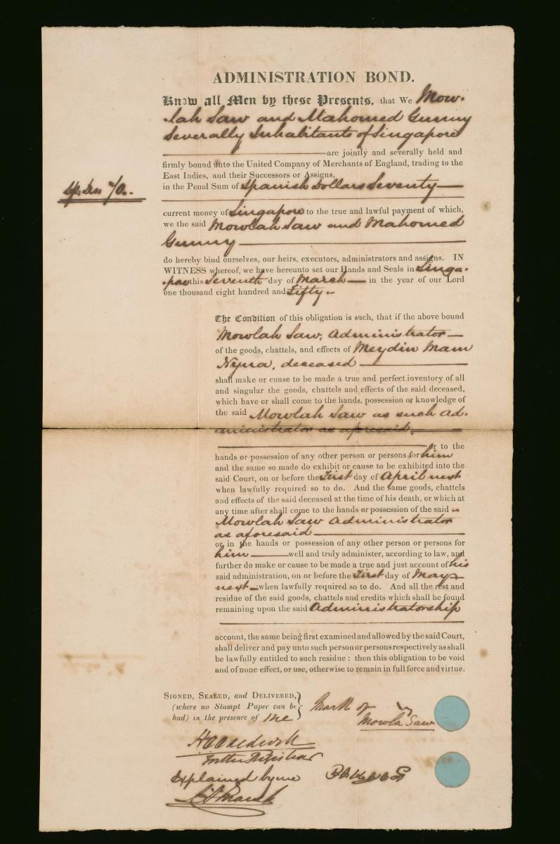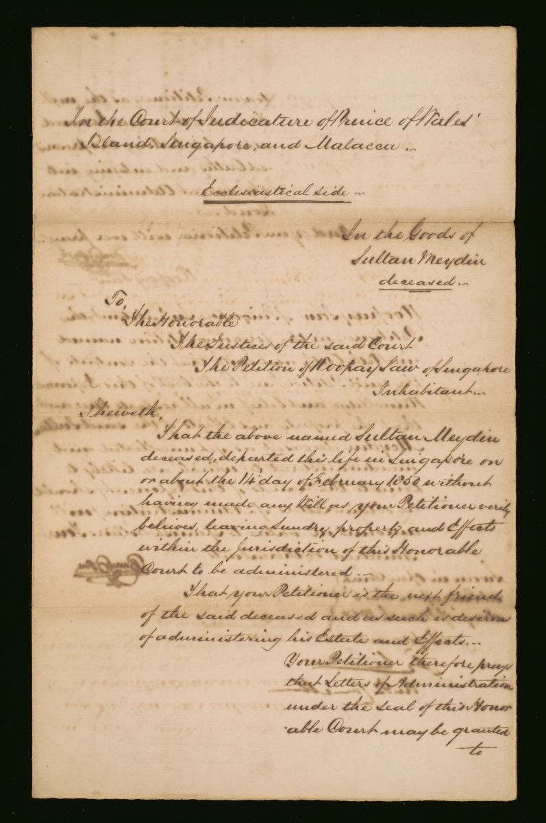 This is a petition filed by Mahomed Meydin Saw of Singapore concerning the administration of the estate of Mahomed Nachia. It is part of a collection of legal documents from the 19th and early 20th centuries which provides a glimpse into the work of the notable personalities who left their mark on Singapore’s legal history, and the economic and other transactions undertaken by ordinary immigrants in 19th century Singapore that tell stories of misfortune and indebtedness which would otherwise have disappeared from history.
