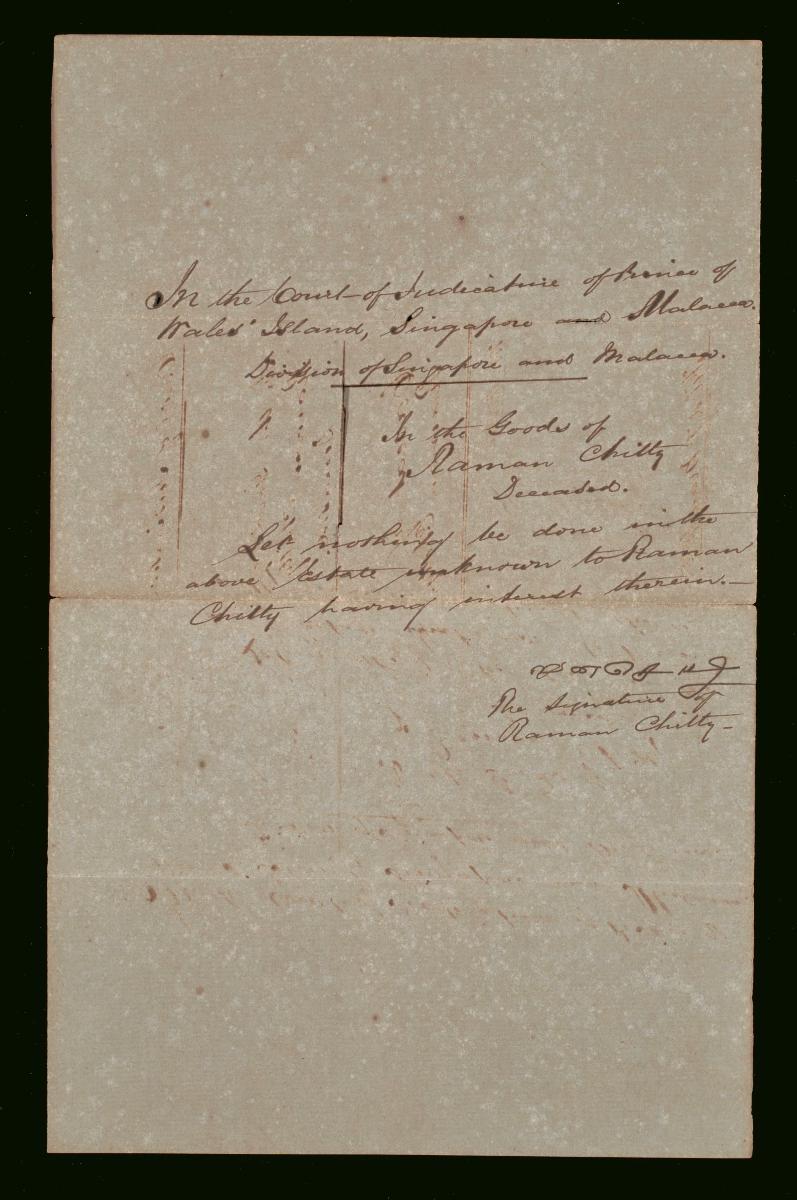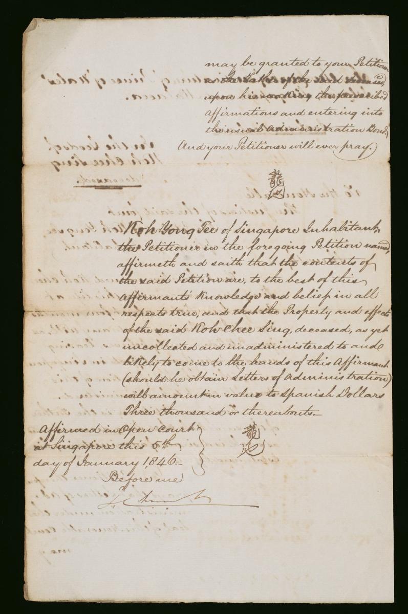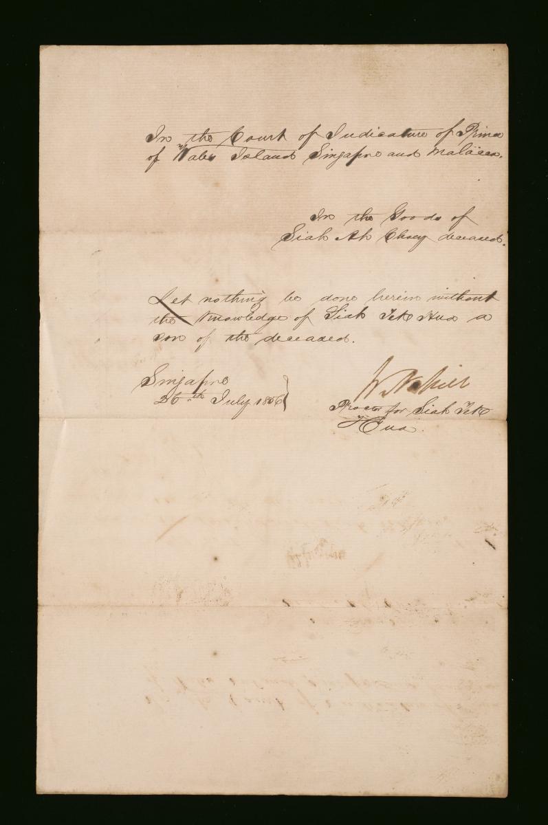 This is a document concerning the administration of the estate of the deceased Sim Yong. It affirms that no action with regards to the estate of the deceased was to be made without the knowledge of Ung Yeong Keng. This document is part of a collection of legal documents from the 19th and early 20th centuries which provides a glimpse into the work of the notable personalities who left their mark on Singapore’s legal history, and the economic and other transactions undertaken by ordinary immigrants in 19th century Singapore that tell stories of misfortune and indebtedness which would otherwise have disappeared from history.