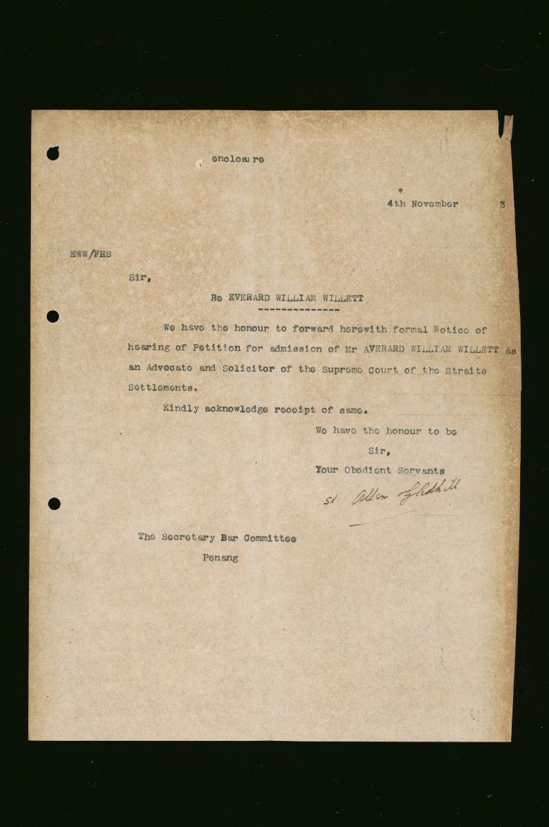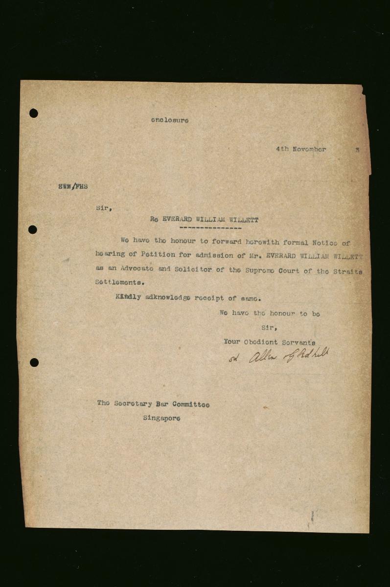 This is the petition of Everard William Willet for his admittance as a solicitor and advocate to the Supreme Court of the Straits Settlements. It is part of a collection of legal documents from the 19th and early 20th centuries which provides a glimpse into the work of the notable personalities who left their mark on Singapore’s legal history, and the economic and other transactions undertaken by ordinary immigrants in 19th century Singapore that tell stories of misfortune and indebtedness which would otherwise have disappeared from history.