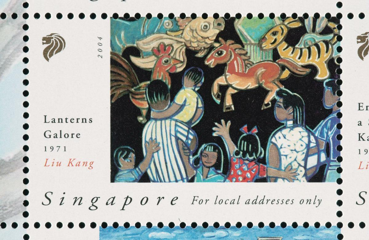 A stamp featuring 'Lanterns Galore, 1971' by Liu Kang
