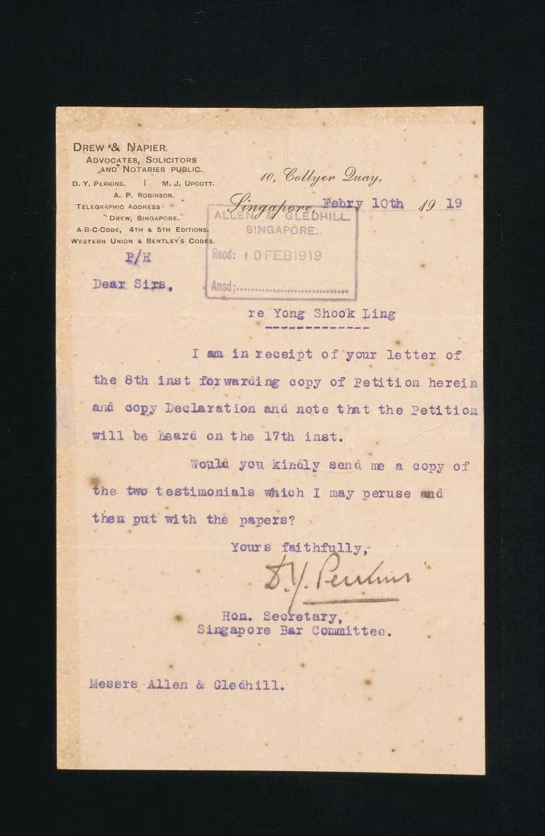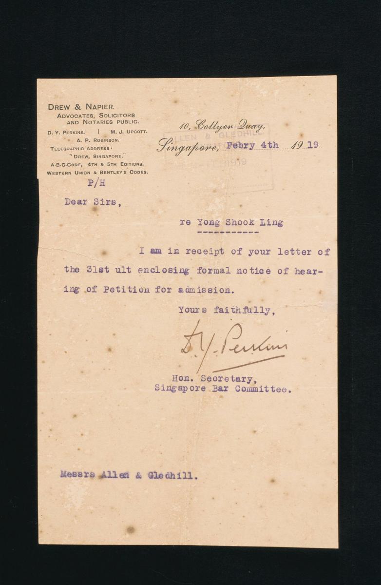 This is a letter of acknowledgement dated 5 November 1913 from the Hon Secretary of the Singapore Bar Committee to Allen and Gledhill, concerning the admission of Everard William Willett as a solicitor and advocate to the Supreme Court of the Straits Settlements. It is part of a collection of legal documents from the 19th and early 20th centuries which provides a glimpse into the work of the notable personalities who left their mark on Singapore’s legal history, and the economic and other transactions undertaken by ordinary immigrants in 19th century Singapore that tell stories of misfortune and indebtedness which would otherwise have disappeared from history.