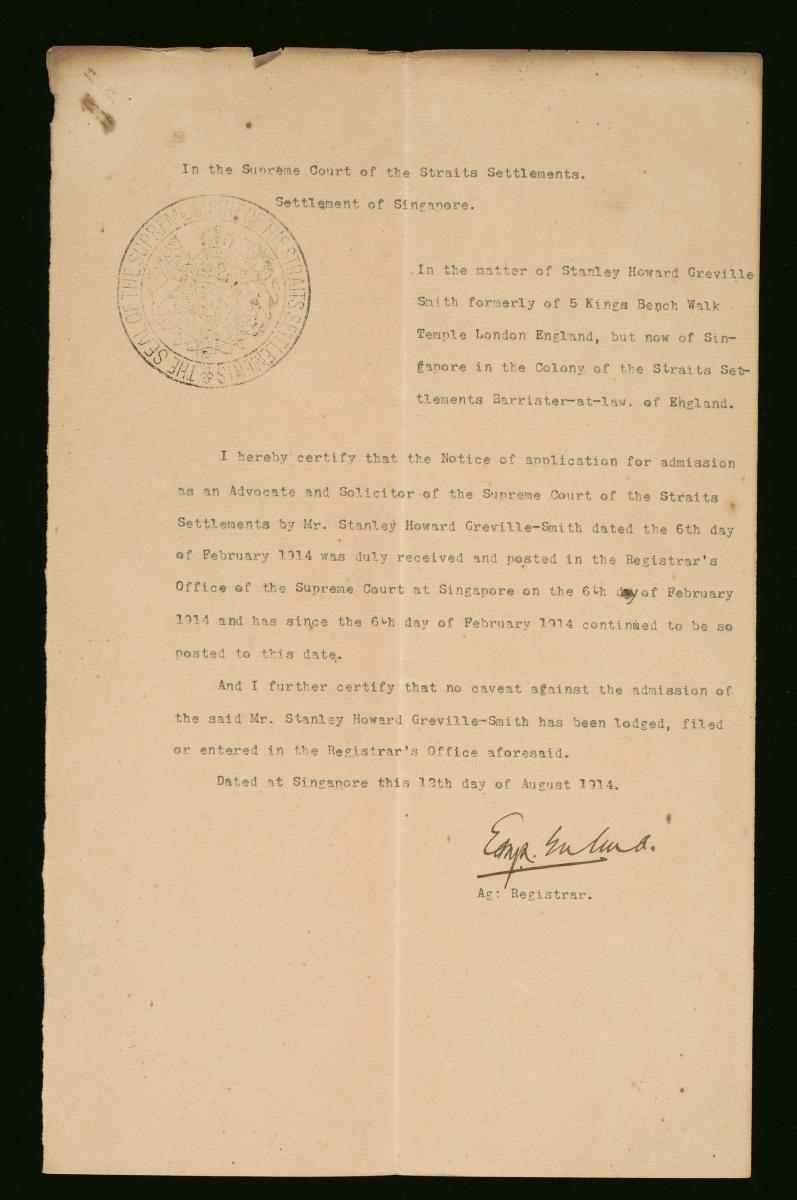 This is a formal notice for the hearing of the petition of Stanley Howard Greville-Smith issued on 31 August 1914, concerning his admission as a solicitor and advocate to the Supreme Court of the Straits Settlements. It is part of a collection of legal documents from the 19th and early 20th centuries which provides a glimpse into the work of the notable personalities who left their mark on Singapore’s legal history, and the economic and other transactions undertaken by ordinary immigrants in 19th century Singapore that tell stories of misfortune and indebtedness which would otherwise have disappeared from history.