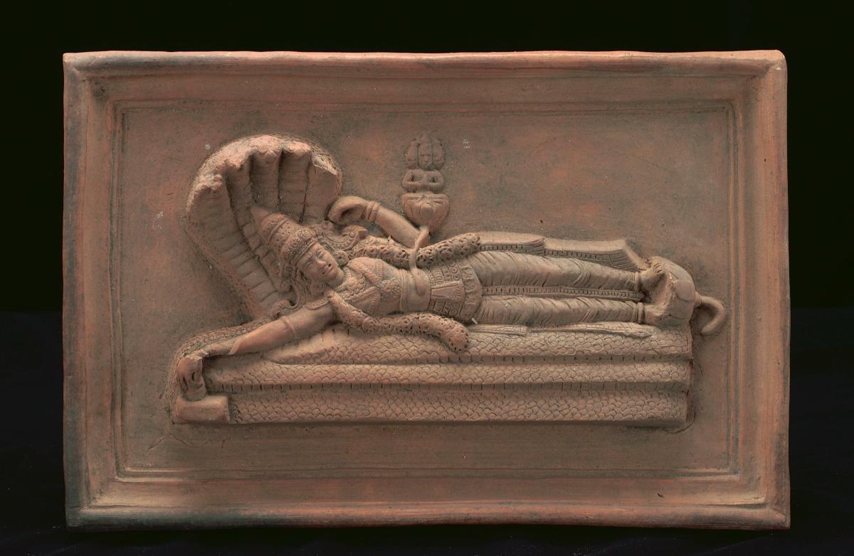 This painting shows Vishnu (God of Preservation) as a four-armed deity seated on the back of the thousand-headed serpent, Seshanaga, in the cosmic ocean. His four hands are holding his standard attributes namely, the discus, conch, mace and lotus. His consort, Lakshmi is shown massaging his feet. This iconography is commonly known as Sheshashayi Vishnu. The scene depicts the process of the creation of the universe whereby the four-headed Brahma (God of Creation) seated in a large lotus flower emerges from Vishnu’s navel, and began to create the universe. This painting either belongs to the Chamba or Kangra Jammu/Kashmir school of Pahari paintings and is unique because it features the patron, Maharaja Gulab Singh, who possibly commissioned it.