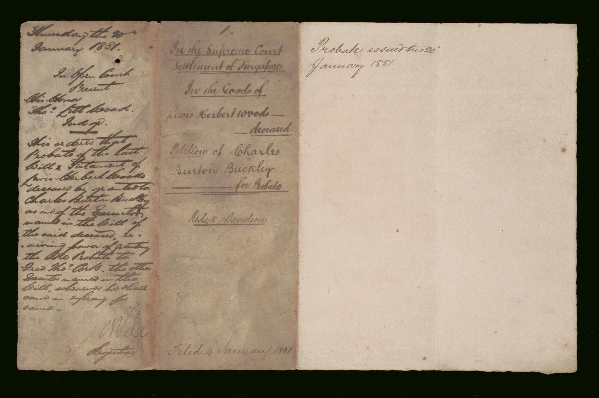 This is a cover page of the executor's account of the goods of Thomas Church filed on 19 January 1864. It is part of a collection of legal documents from the 19th and early 20th centuries which provides a glimpse into the work of the notable personalities who left their mark on Singapore’s legal history, and the economic and other transactions undertaken by ordinary immigrants in 19th century Singapore that tell stories of misfortune and indebtedness which would otherwise have disappeared from history.