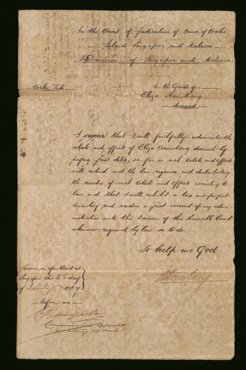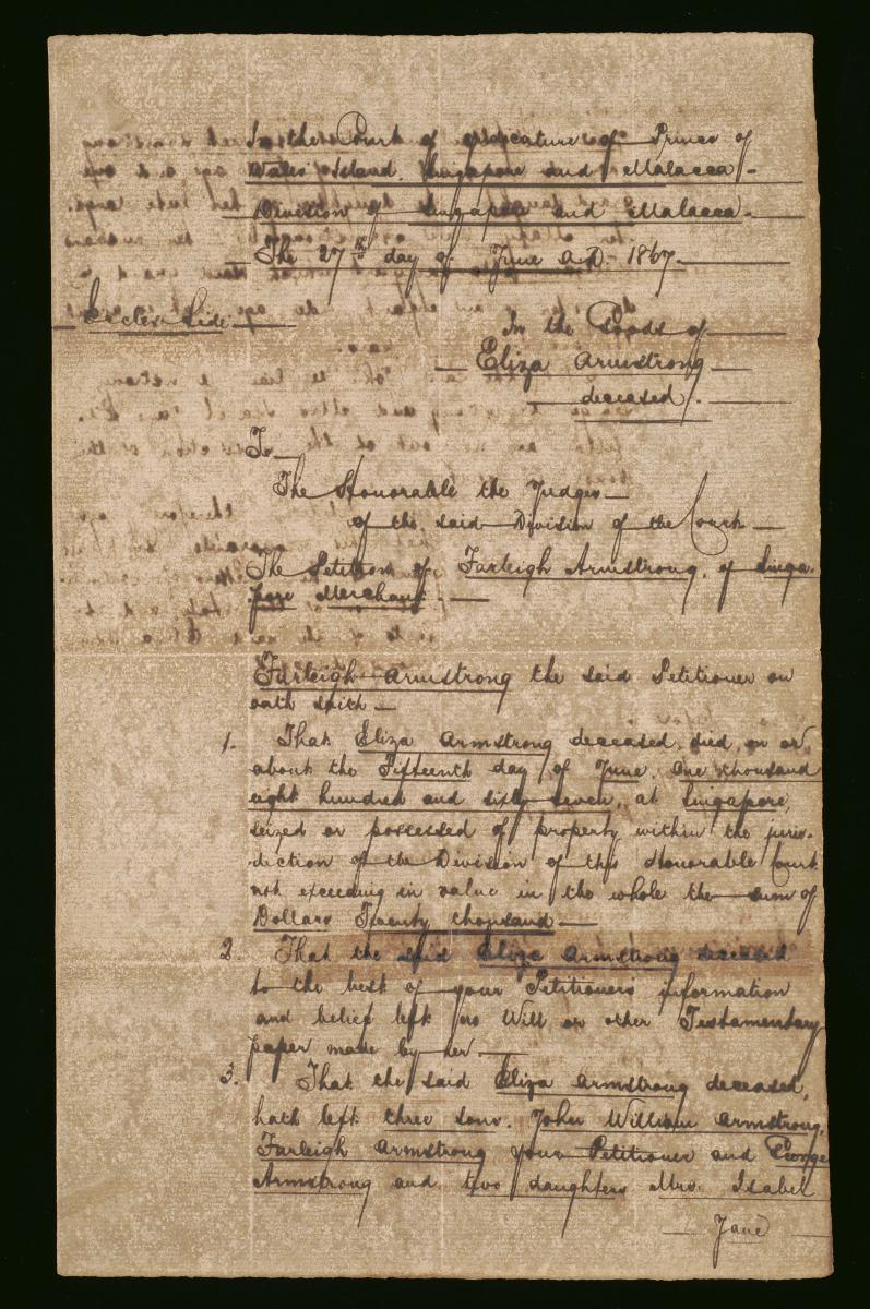 This is the petition of Mary Armstrong concerning the administration of the estate of Adam Armstrong. It is part of a collection of legal documents from the 19th and early 20th centuries which provides a glimpse into the work of the notable personalities who left their mark on Singapore’s legal history, and the economic and other transactions undertaken by ordinary immigrants in 19th century Singapore that tell stories of misfortune and indebtedness which would otherwise have disappeared from history.