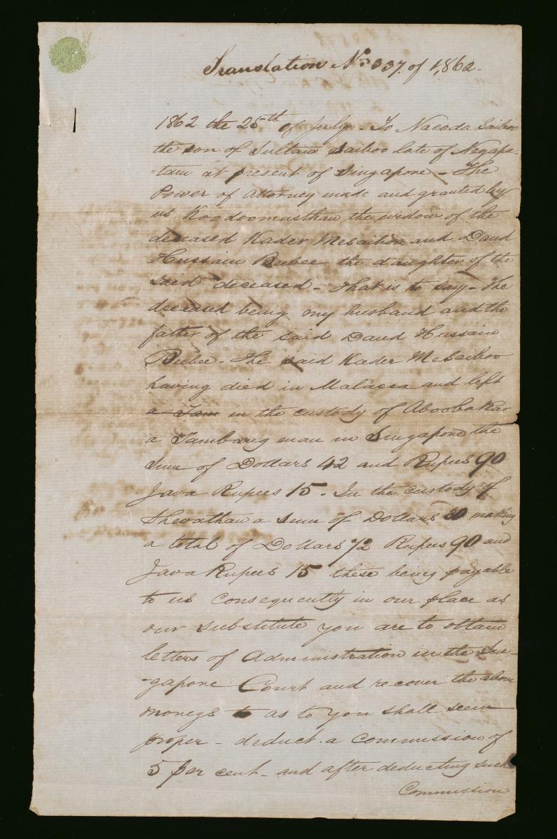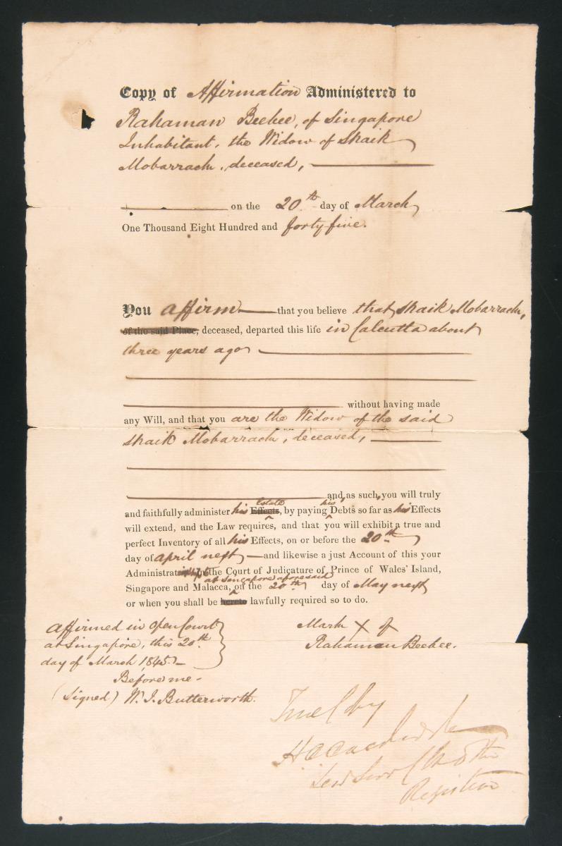 This is an affirmation sworn by Rahaman Beebee on 20 March 1845 concerning the administration of the estate of her deceased husband, Shaik Mobarrachi. It is part of a collection of legal documents from the 19th and early 20th centuries which provides a glimpse into the work of the notable personalities who left their mark on Singapore’s legal history, and the economic and other transactions undertaken by ordinary immigrants in 19th century Singapore that tell stories of misfortune and indebtedness which would otherwise have disappeared from history.