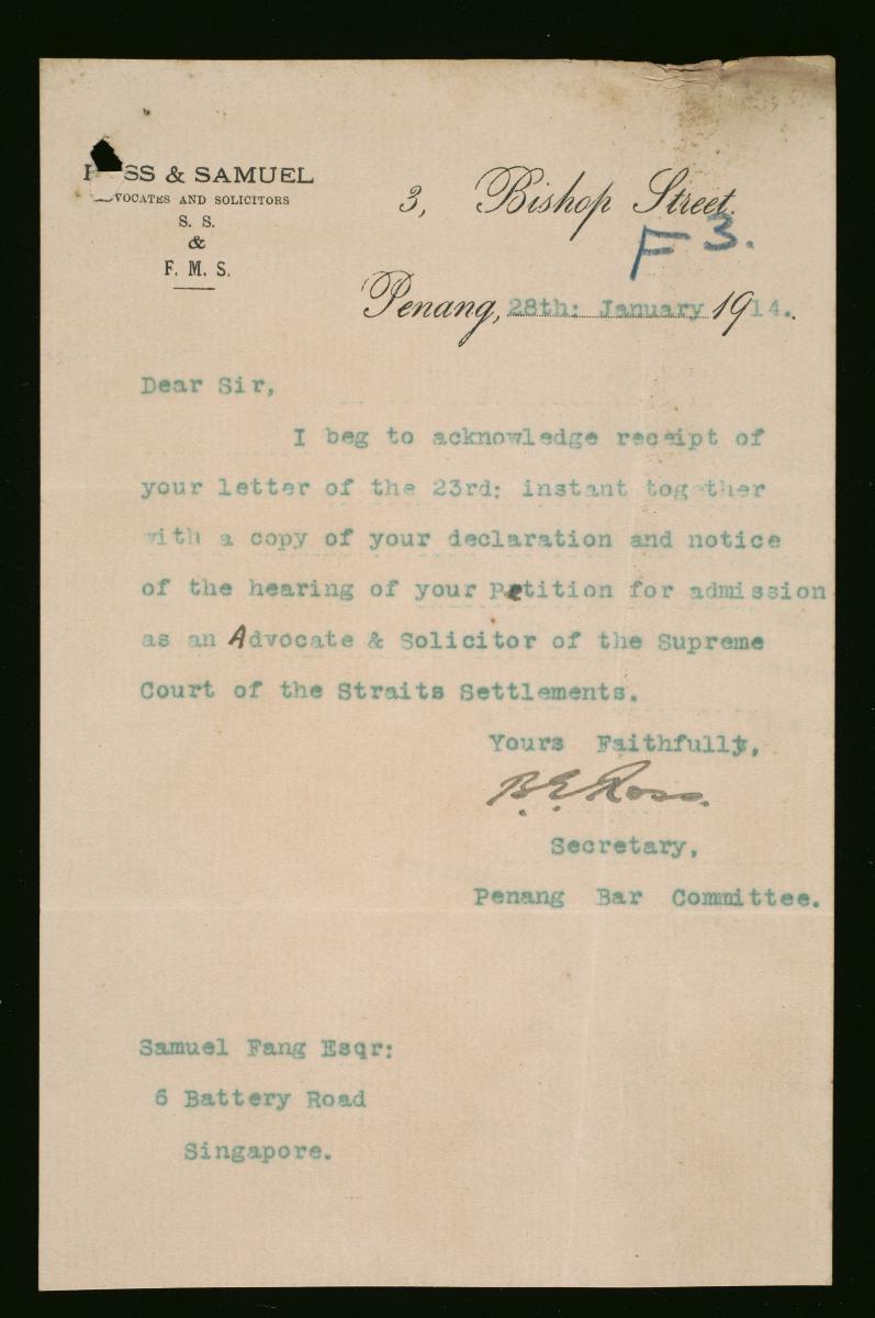 This is a letter dated 28 July 1913 from the Secretary of the Bar Committee of Singapore to Samuel Fung. It is part of a collection of legal documents from the 19th and early 20th centuries which provides a glimpse into the work of the notable personalities who left their mark on Singapore’s legal history, and the economic and other transactions undertaken by ordinary immigrants in 19th century Singapore that tell stories of misfortune and indebtedness which would otherwise have disappeared from history.