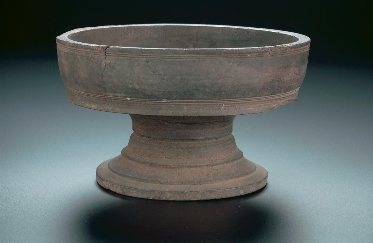 This funnel-shaped basket has a round rim and a square base. The pedestal is of carved wood with feather motif in steps and mirrorred bird motif. It is coloured with vemillion and gilded with goldleaf. It was probably used on special occassions to serve cooked rice.