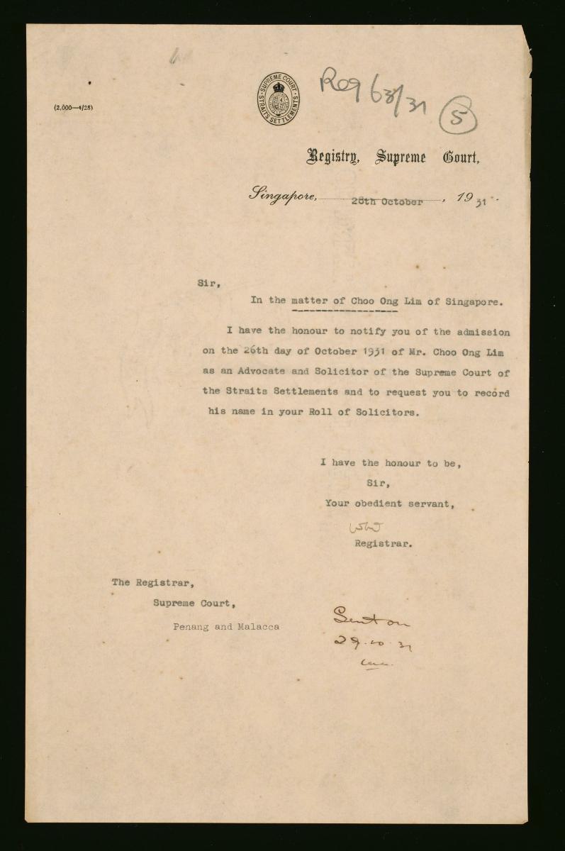 This is a request made on 14 April 1931 by the Registrar of the Supreme Court, Singapore to the Registrars of the Supreme Courts of Penang and Malacca, concerning the petition of Choo Ong Lim. It is part of a collection of legal documents from the 19th and early 20th centuries which provides a glimpse into the work of the notable personalities who left their mark on Singapore’s legal history, and the economic and other transactions undertaken by ordinary immigrants in 19th century Singapore that tell stories of misfortune and indebtedness which would otherwise have disappeared from history.