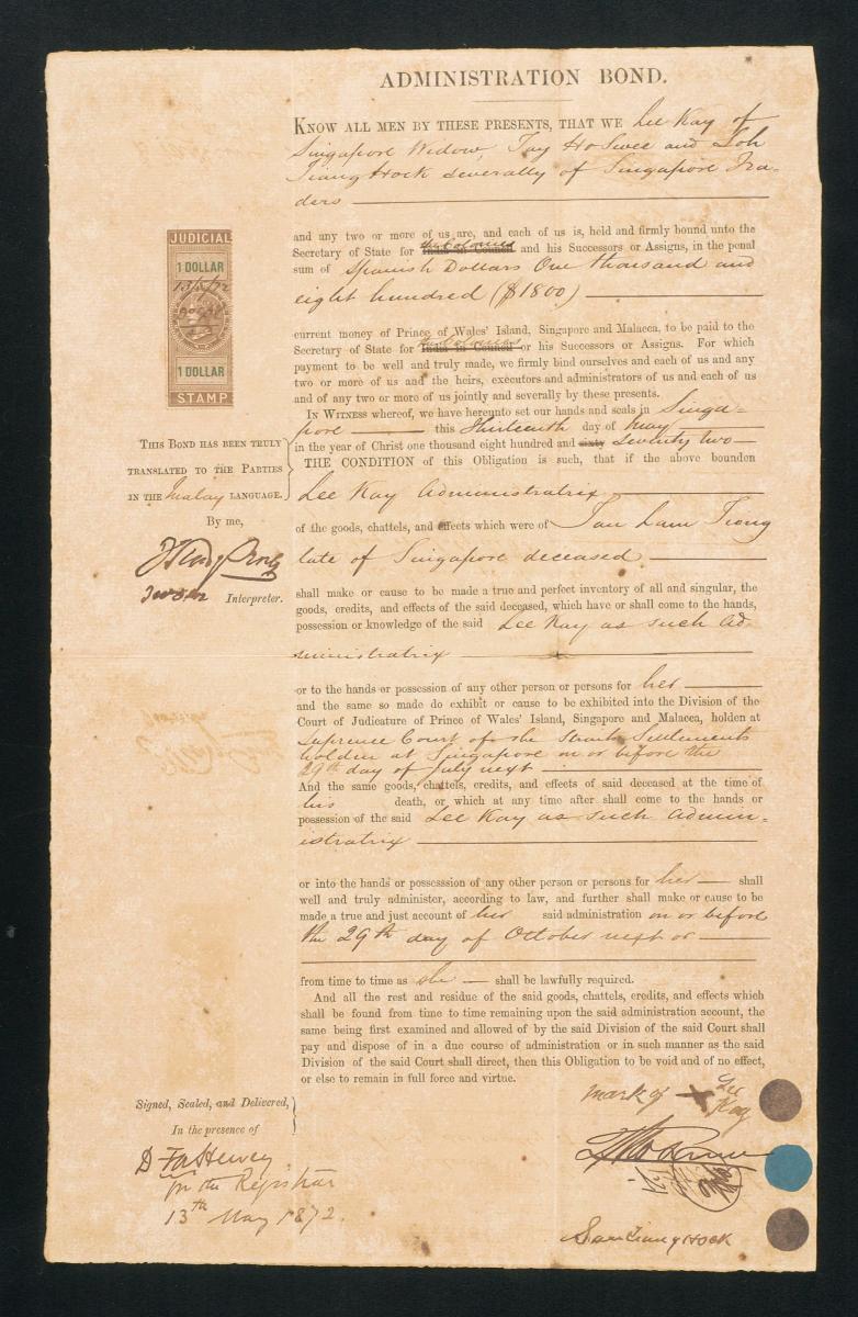 This is the administration bond of Pedro Tan No Keah, Goh Ann, and Tay Boon Chye made on 20 January 1869 concerning the administration of the estate of the deceased George William Le Cerf. It is part of a collection of legal documents from the 19th and early 20th centuries which provides a glimpse into the work of the notable personalities who left their mark on Singapore’s legal history, and the economic and other transactions undertaken by ordinary immigrants in 19th century Singapore that tell stories of misfortune and indebtedness which would otherwise have disappeared from history.