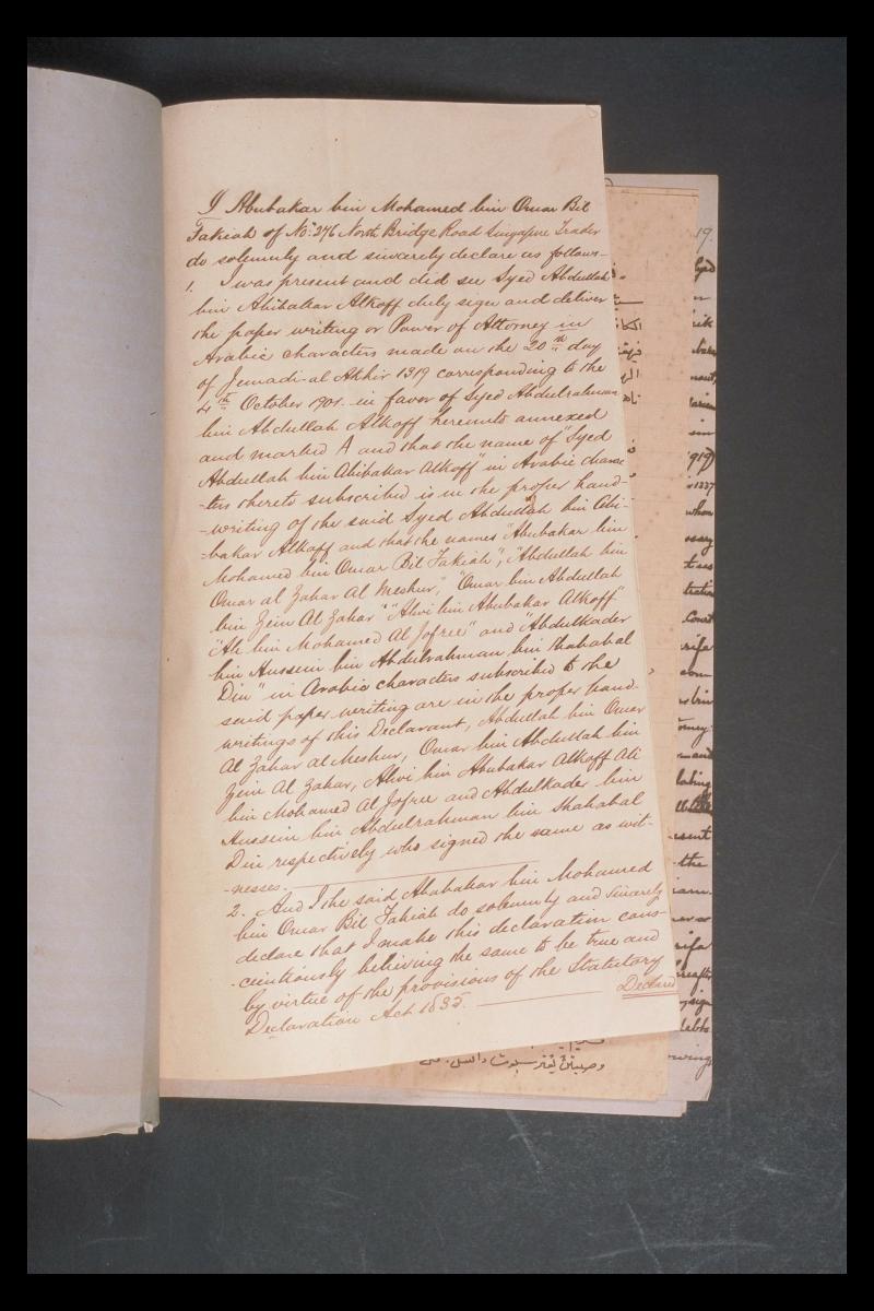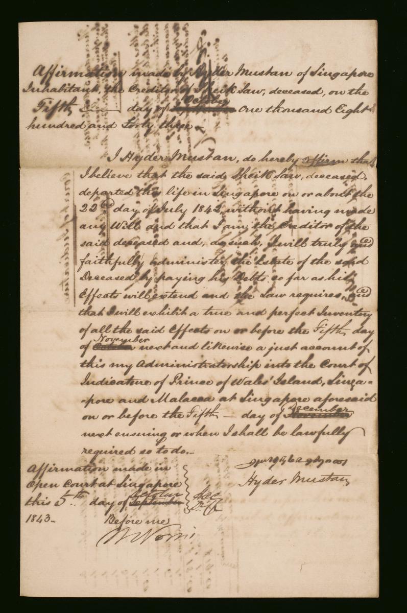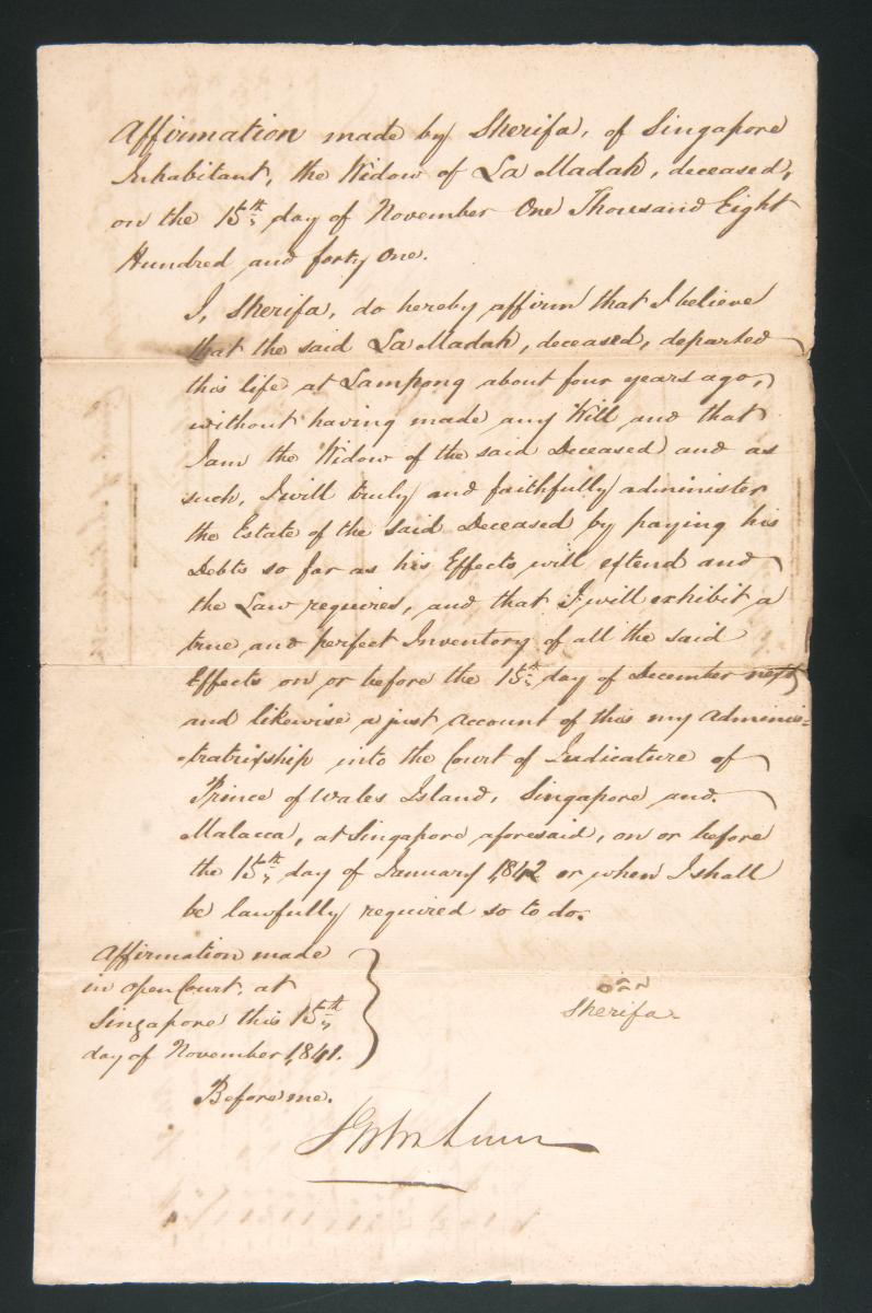 This is the affirmation sworn by Mohamed Beg on 14 October 1841, concerning the estate of the deceased Johannis. It is part of a collection of legal documents from the 19th and early 20th centuries which provides a glimpse into the work of the notable personalities who left their mark on Singapore’s legal history, and the economic and other transactions undertaken by ordinary immigrants in 19th century Singapore that tell stories of misfortune and indebtedness which would otherwise have disappeared from history.