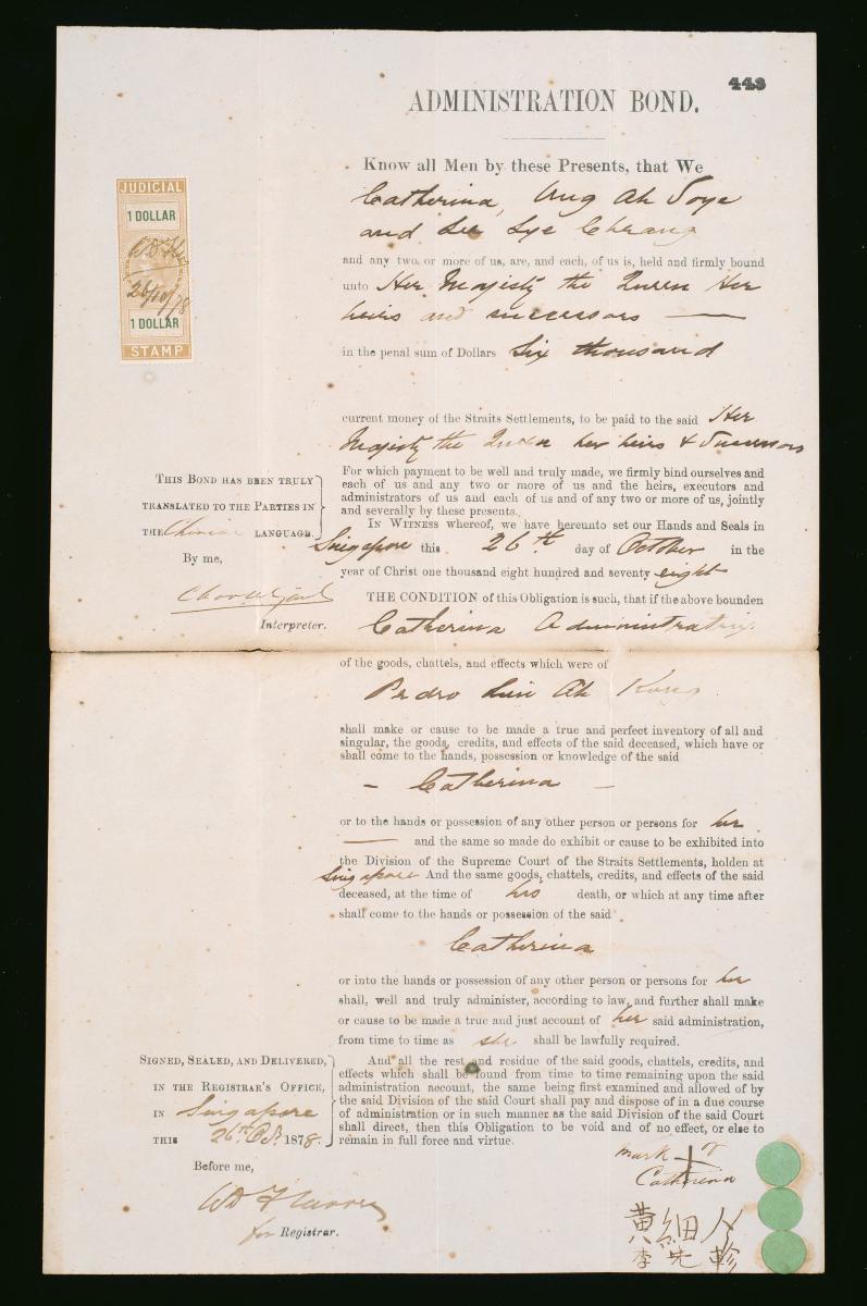 This is the administration bond of Cheah Loy Fook, Chin Kee Fong, and Lee Shin made on 20 April 1880 concerning the administration of the estate of the deceased Cheah Foo Wong. It is part of a collection of legal documents from the 19th and early 20th centuries which provides a glimpse into the work of the notable personalities who left their mark on Singapore’s legal history, and the economic and other transactions undertaken by ordinary immigrants in 19th century Singapore that tell stories of misfortune and indebtedness which would otherwise have disappeared from history.