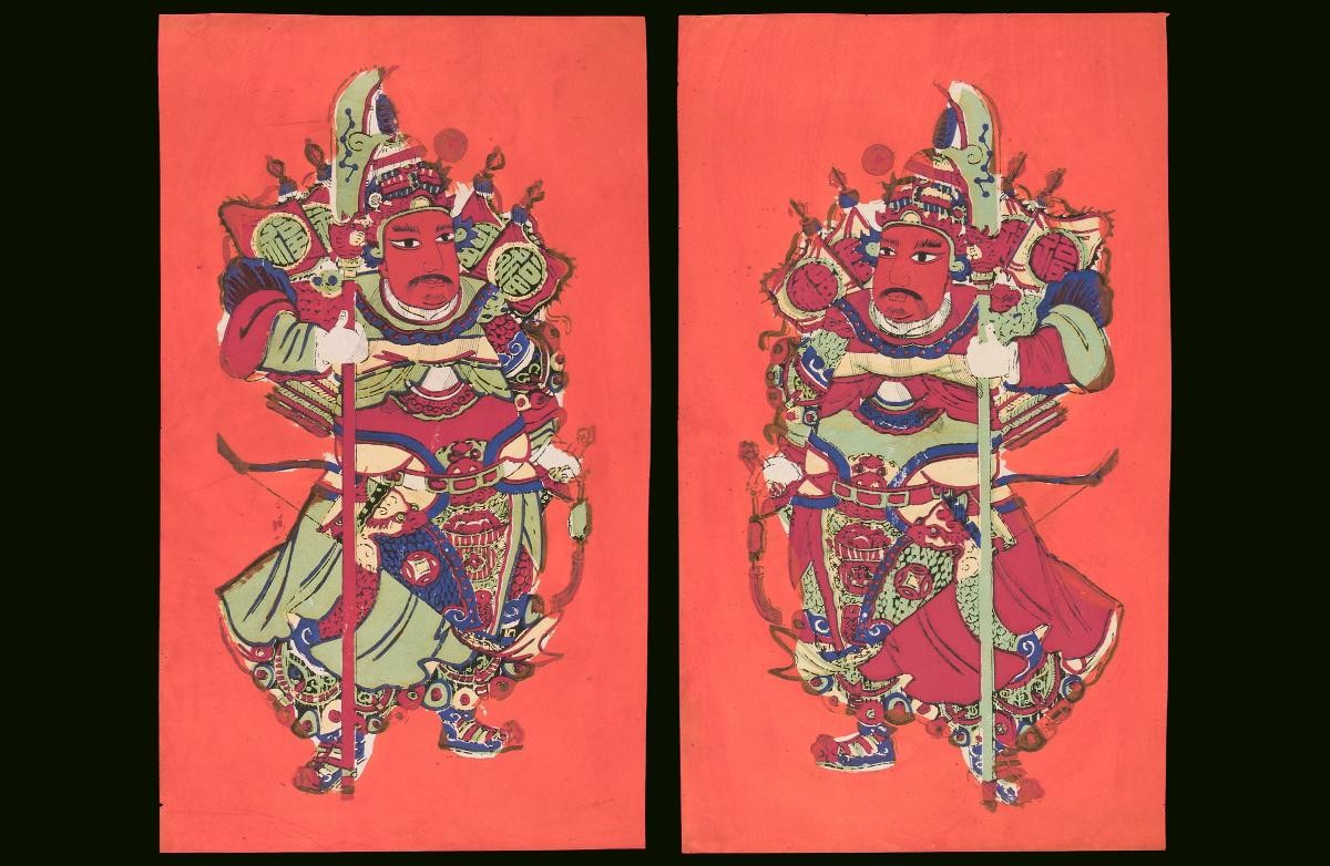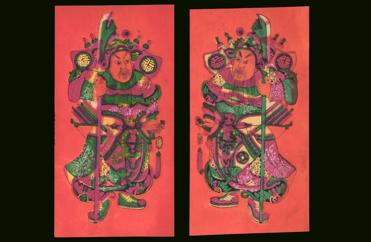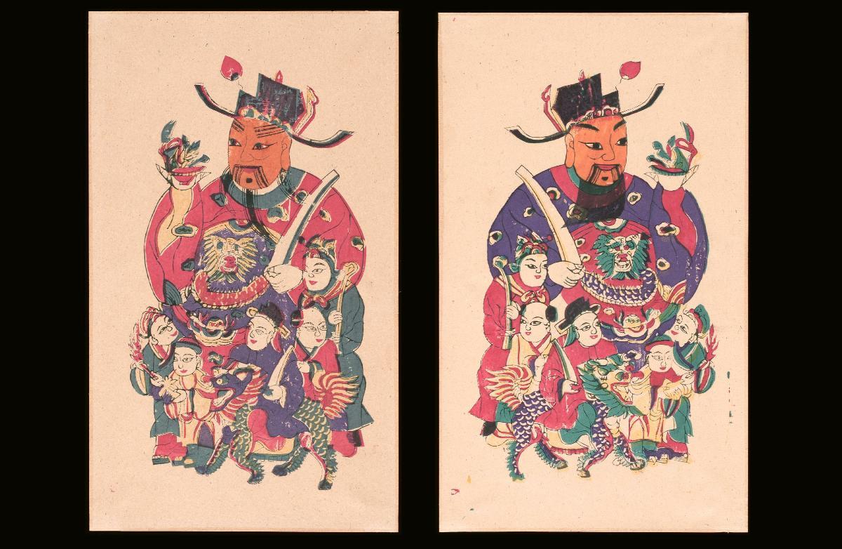 This pair of Jiangsu woodblock prints represents symmetrical images of different blessings. The image on the right features, Pingan Xiqing, "Peace and Festivity" and Siji Xinglong, "Prosperity throughout the four seasons" on the left.