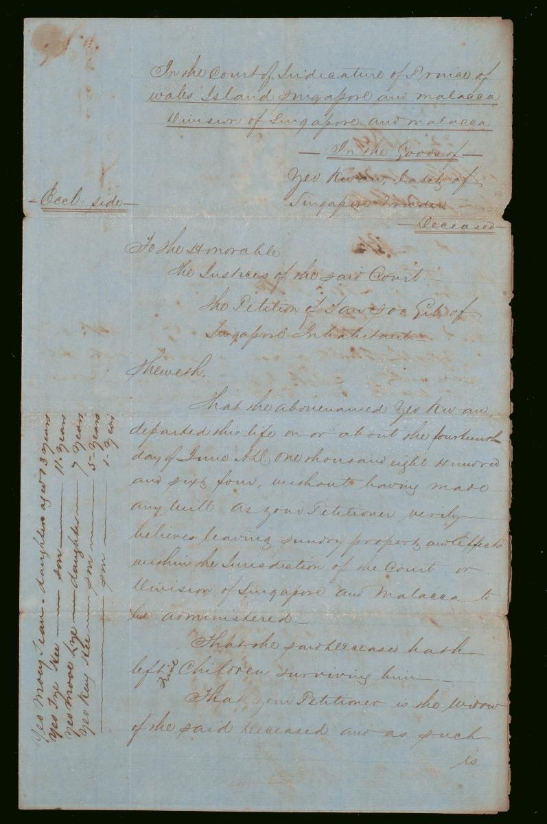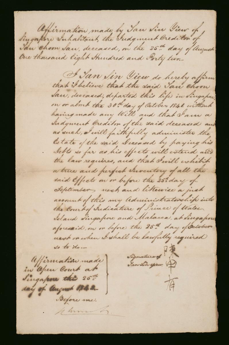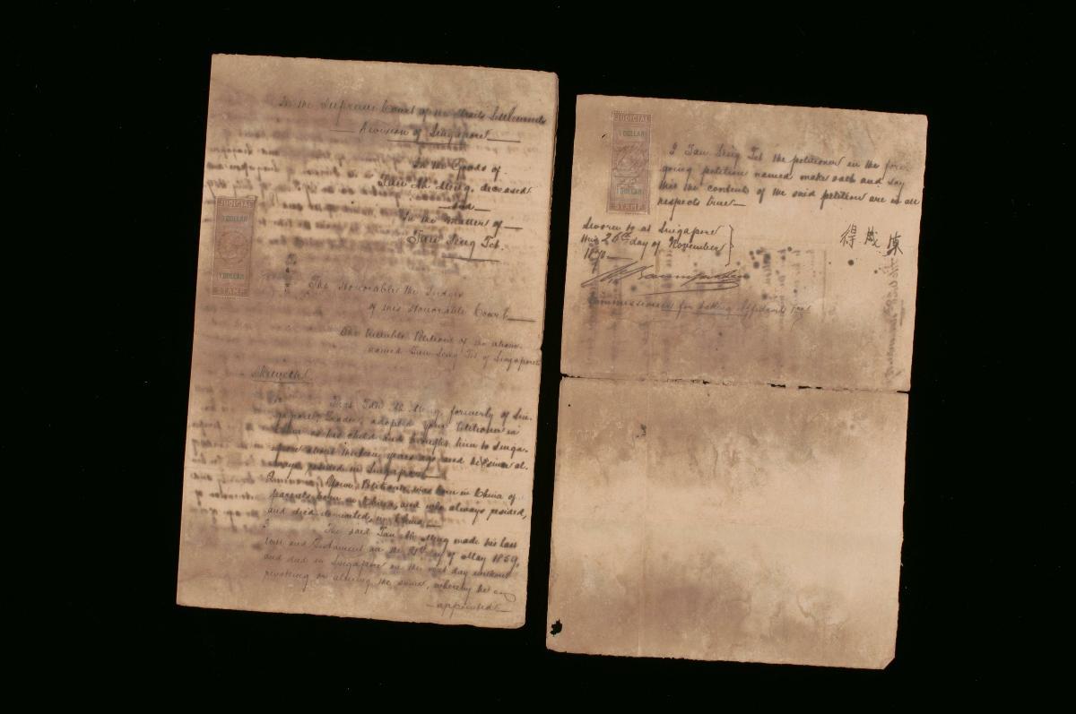 This is the petition of Tan Sin Yiew of Singapore concerning the administration of the estate of the deceased Tan Choon Saw. It is part of a collection of legal documents from the 19th and early 20th centuries which provides a glimpse into the work of the notable personalities who left their mark on Singapore’s legal history, and the economic and other transactions undertaken by ordinary immigrants in 19th century Singapore that tell stories of misfortune and indebtedness which would otherwise have disappeared from history.