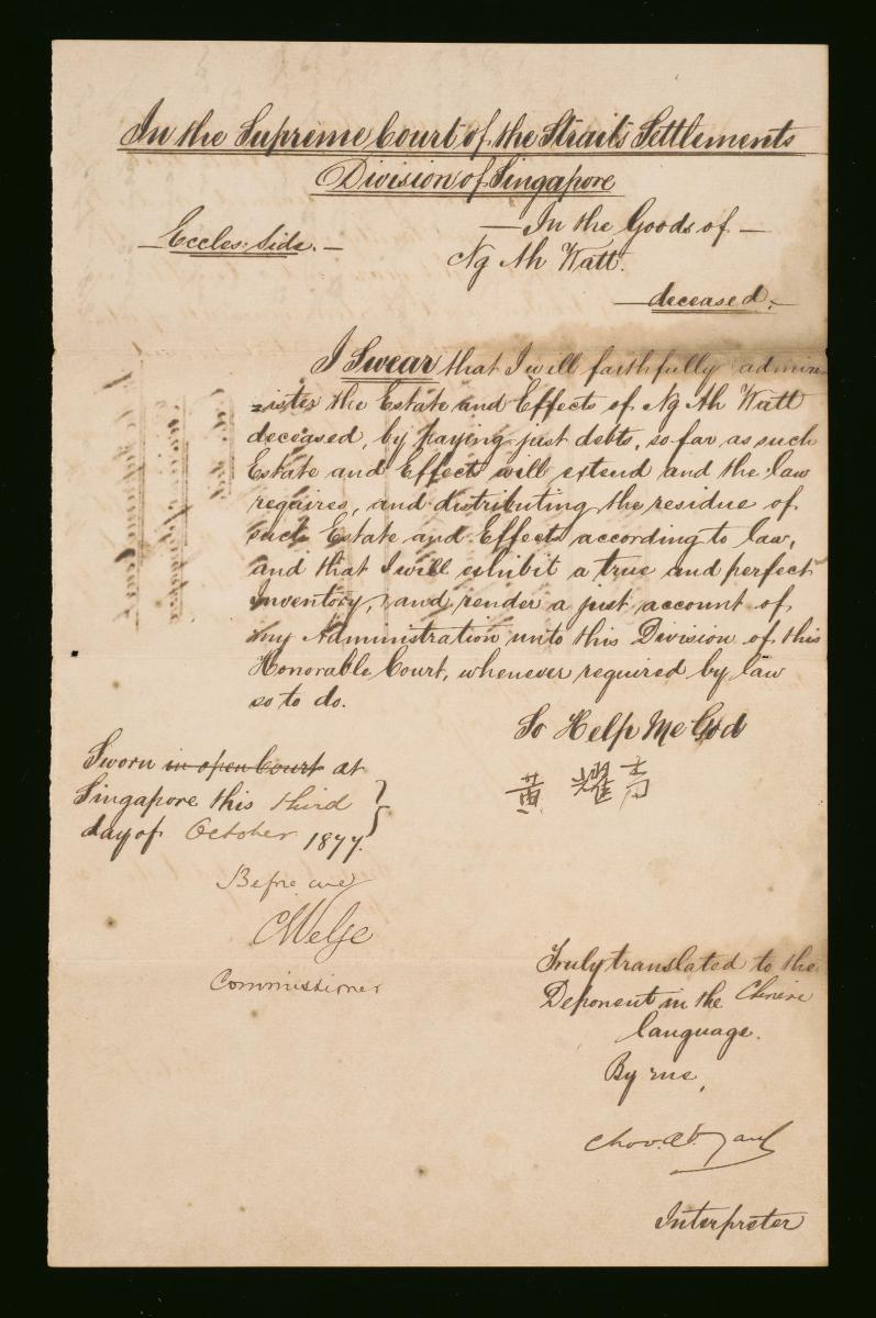 This is an oath sworn by Cai Wen Sheng on 17 November 1863 concerning the administration of the estate of the deceased Choa Choon Seek. It is part of a collection of legal documents from the 19th and early 20th centuries which provides a glimpse into the work of the notable personalities who left their mark on Singapore’s legal history, and the economic and other transactions undertaken by ordinary immigrants in 19th century Singapore that tell stories of misfortune and indebtedness which would otherwise have disappeared from history.