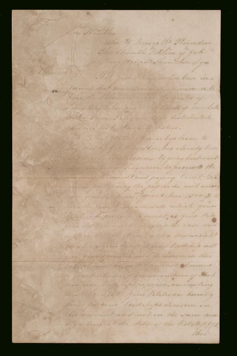 This is the petition of Goh Kang Hai concerning the administration of the estate of the deceased Sehow Pai Guat. It is part of a collection of legal documents from the 19th and early 20th centuries which provides a glimpse into the work of the notable personalities who left their mark on Singapore’s legal history, and the economic and other transactions undertaken by ordinary immigrants in 19th century Singapore that tell stories of misfortune and indebtedness which would otherwise have disappeared from history.