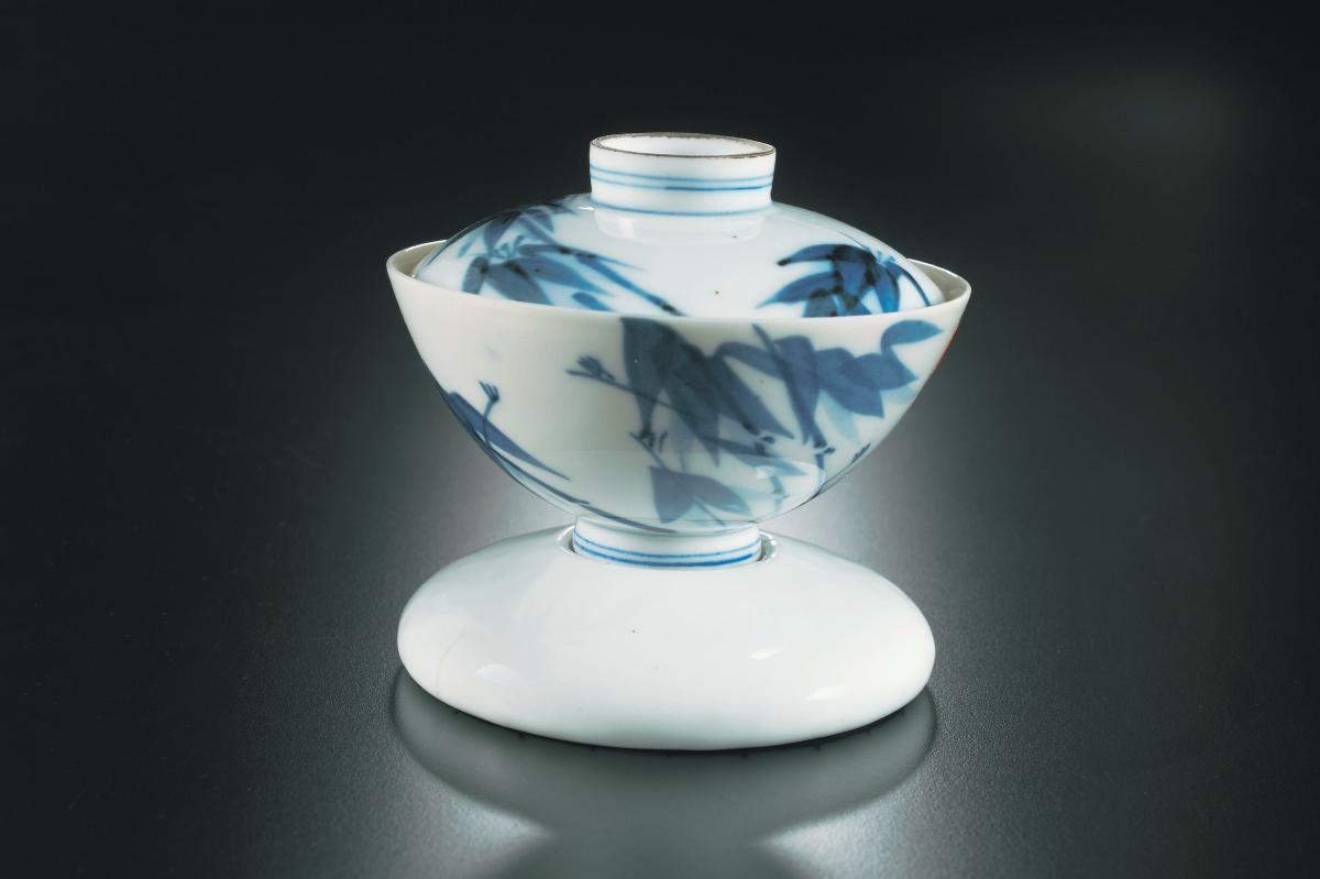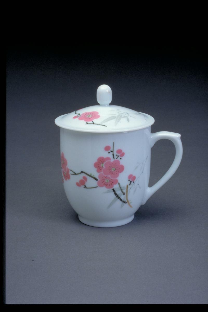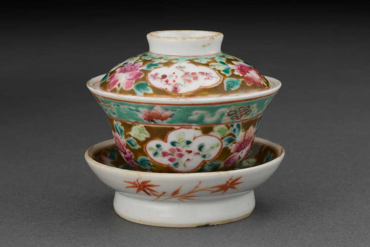 This teacup cover is decorated on a white ground with shades of green, red, brown and pink with a factory mark stamped on the top. Three roundels containing the double happiness characters 'shuang xi' alternate with peony sprays. Teacups are one of the most common items in Straits Chinese porcelain.The collective Baba Malay term for dining ware is 'pinggan mangkok', which literally means 'plates and bowls'. The dinner service can also include cups, saucers, spoons and spoon rests. Wealthy Peranakan families often commissioned the highest quality porcelain wares for special occasions that would bear their surnames.