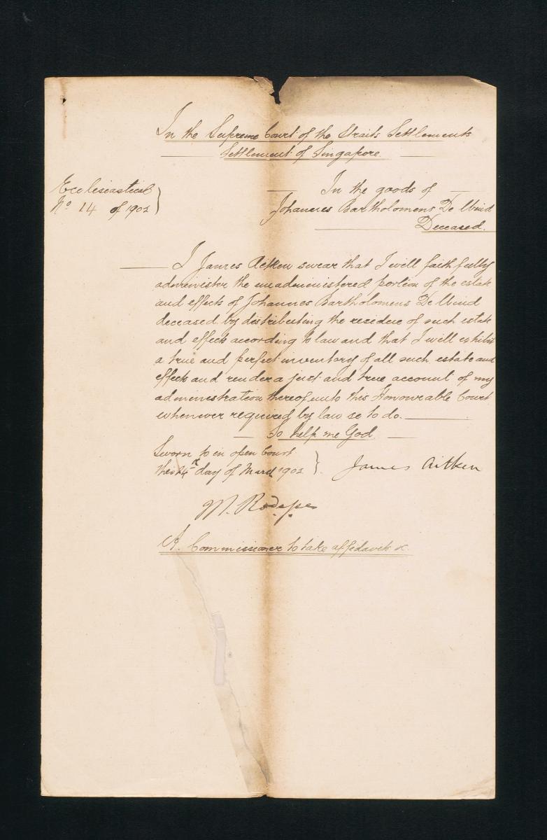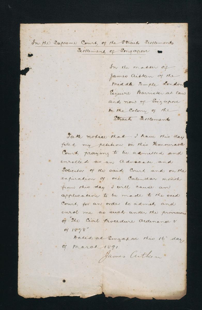 This is a declaration made by James Aitken on 16 March 1891 concerning his petition for admission as a solicitor and advocate to the Supreme Court of the Straits Settlements. It is part of a collection of legal documents from the 19th and early 20th centuries which provides a glimpse into the work of the notable personalities who left their mark on Singapore’s legal history, and the economic and other transactions undertaken by ordinary immigrants in 19th century Singapore that tell stories of misfortune and indebtedness which would otherwise have disappeared from history.