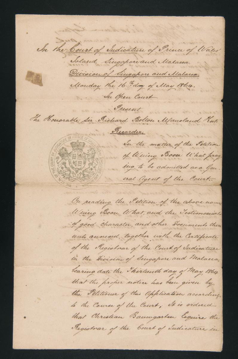 These are the examination results of Wuing Boon What concerning his application to be admitted as a general agent of the Court of Judicature of Prince of Wales' Island, Singapore, and Malacca. They are part of a collection of legal documents from the 19th and early 20th centuries which provides a glimpse into the work of the notable personalities who left their mark on Singapore’s legal history, and the economic and other transactions undertaken by ordinary immigrants in 19th century Singapore that tell stories of misfortune and indebtedness which would otherwise have disappeared from history.