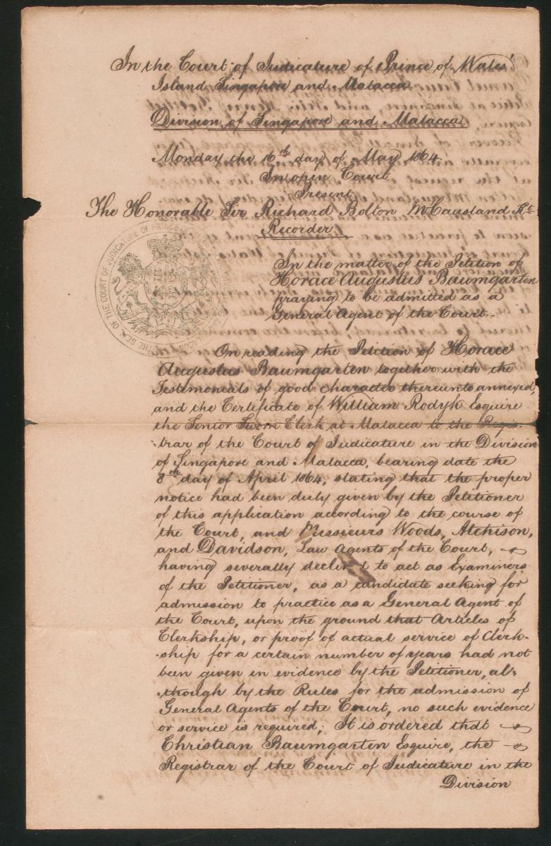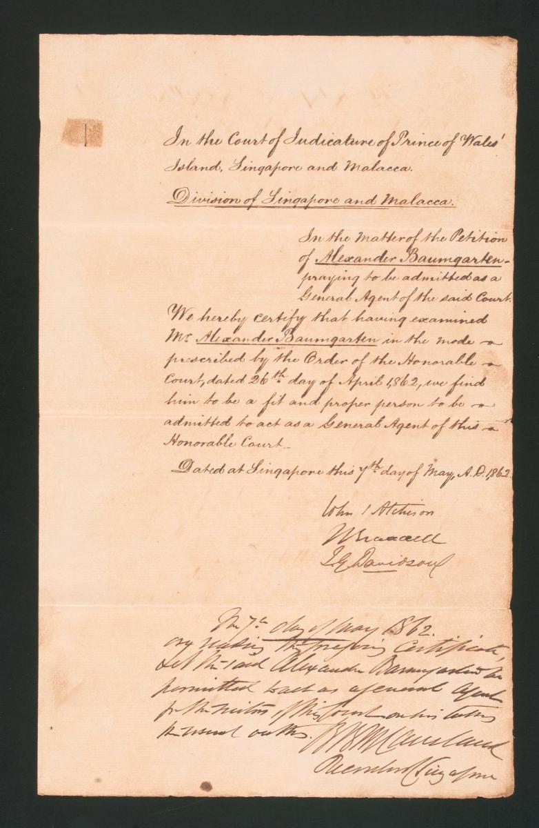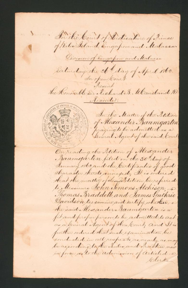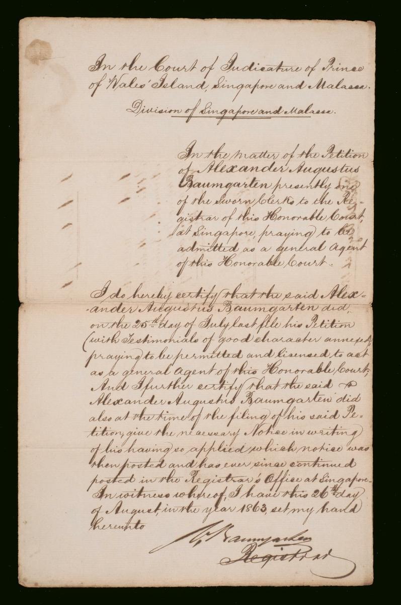 This is an order issued on 26 August 1863 by the Court of Judicature of Prince of Wales' Island, Singapore and Malacca concerning the admission of Alexander Augustus Baumgarten as a general agent to the Court. It is part of a collection of legal documents from the 19th and early 20th centuries which provides a glimpse into the work of the notable personalities who left their mark on Singapore’s legal history, and the economic and other transactions undertaken by ordinary immigrants in 19th century Singapore that tell stories of misfortune and indebtedness which would otherwise have disappeared from history.