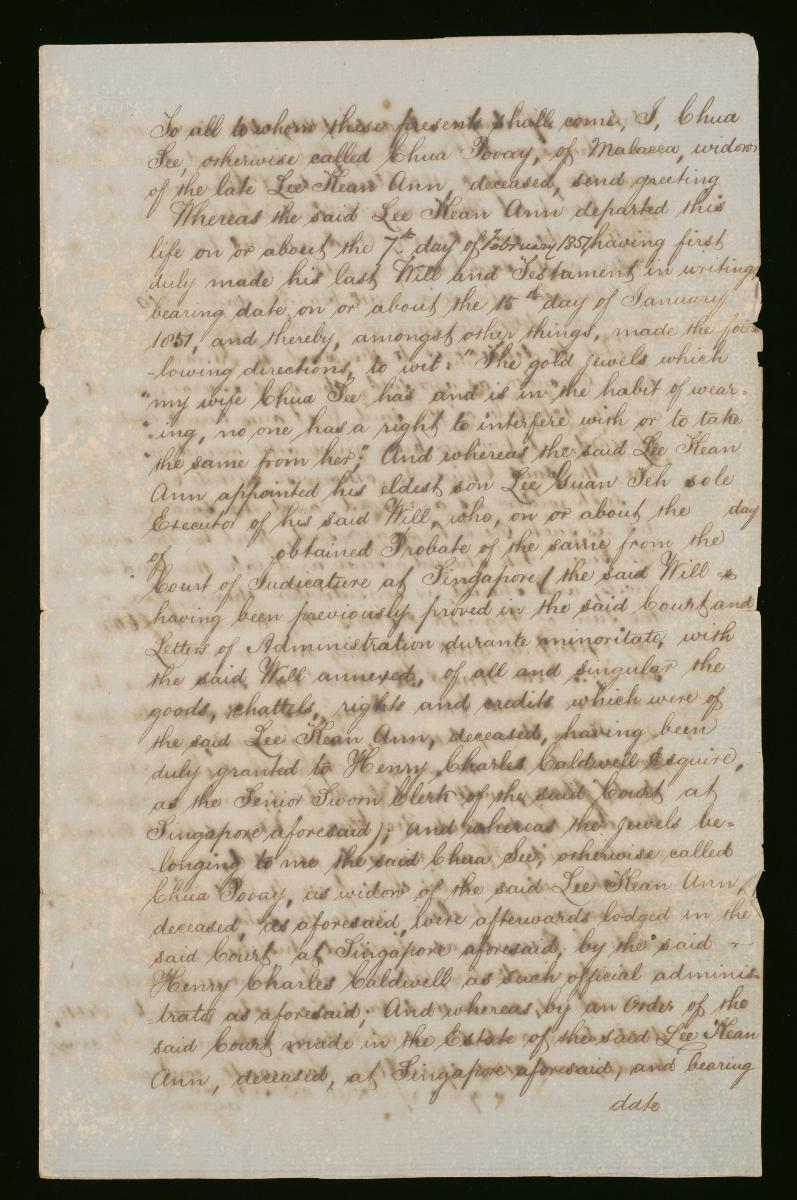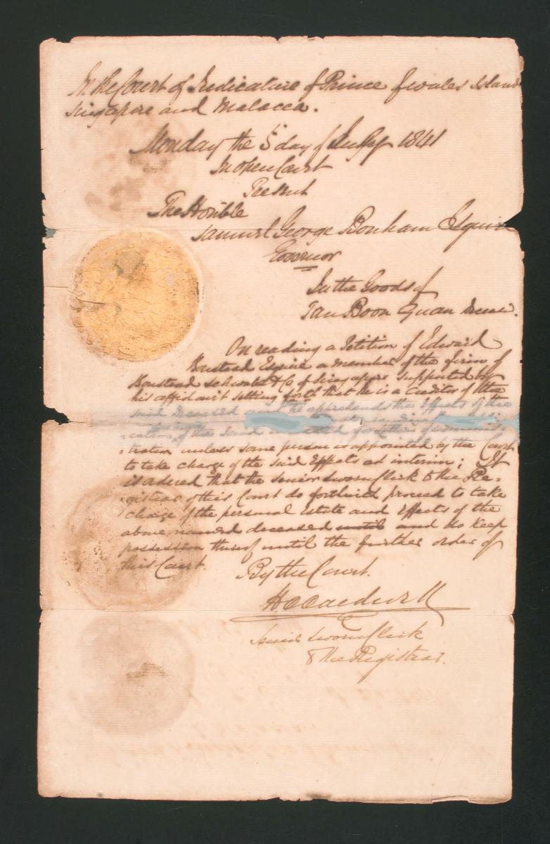 This is a document concerning the estate of the deceased Lee Kean Aw. The legal representative of Lee Guan Teck, Mr Earl, called for the letters of administration for the estate of the deceased to be granted to an officer of the Court of Judicature of Prince of Wales' Island, Singapore and Malacca. It is part of a collection of legal documents from the 19th and early 20th centuries which provides a glimpse into the work of the notable personalities who left their mark on Singapore’s legal history, and the economic and other transactions undertaken by ordinary immigrants in 19th century Singapore that tell stories of misfortune and indebtedness which would otherwise have disappeared from history.