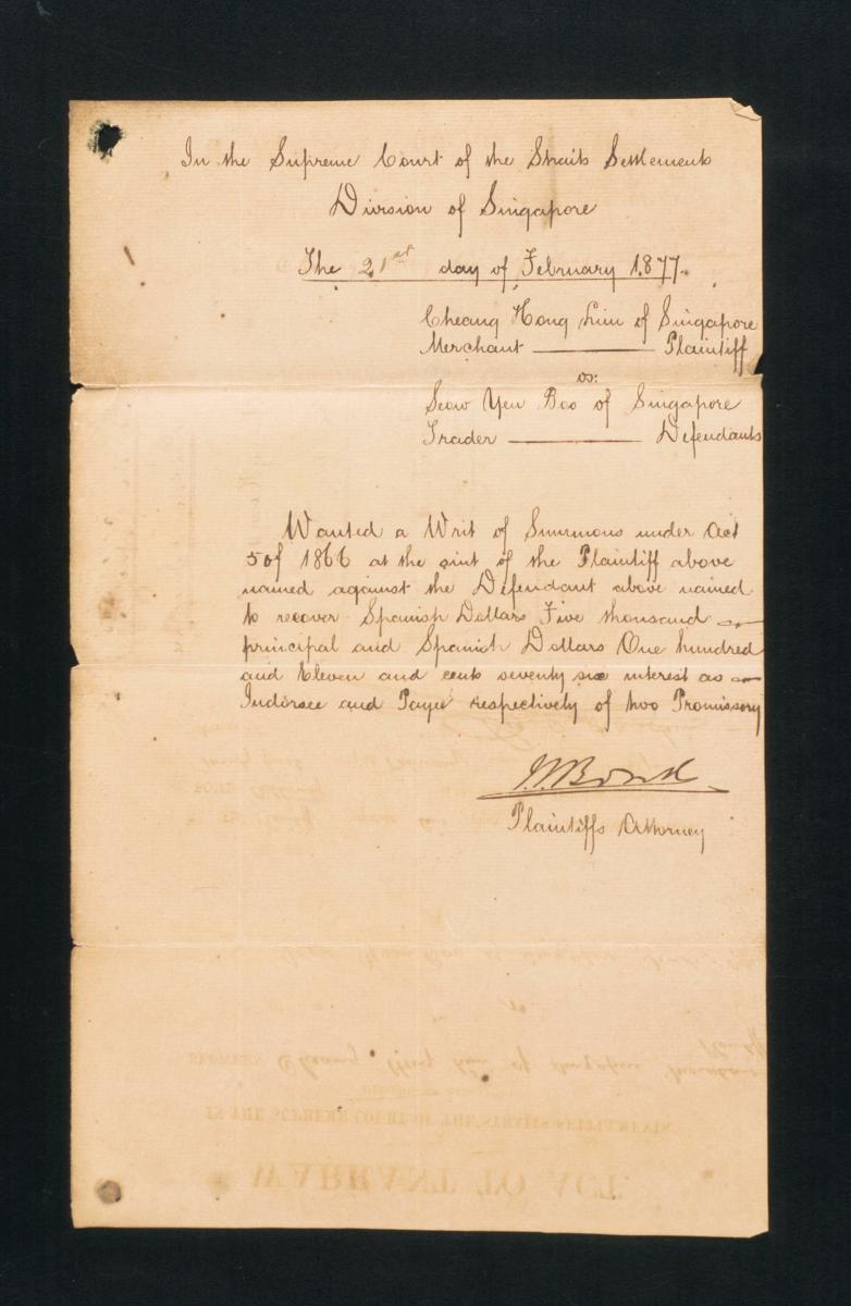 This is a letter dated 25 November 1851 addressed to A.C. Caldwell, a senior sworn clerk from the court registry, concerning the suit between Yee What Neo (plaintiff) and Sit Chea and Wee Bok Sing (defendants). It is part of a collection of legal documents from the 19th and early 20th centuries which provides a glimpse into the work of the notable personalities who left their mark on Singapore’s legal history, and the economic and other transactions undertaken by ordinary immigrants in 19th century Singapore that tell stories of misfortune and indebtedness which would otherwise have disappeared from history.
