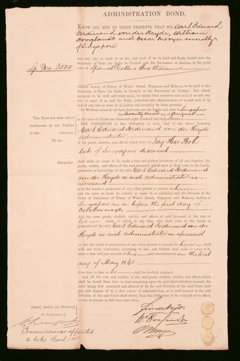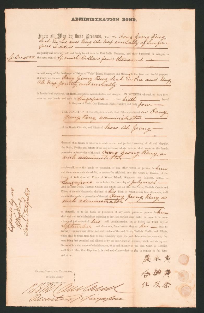 This is the administration bond of Leaow Ah Leong and Edward Lose of Singapore made on 6 November 1865 concerning the administration of the estate of the deceased Chew Kong Leang. It is part of a collection of legal documents from the 19th and early 20th centuries which provides a glimpse into the work of the notable personalities who left their mark on Singapore’s legal history, and the economic and other transactions undertaken by ordinary immigrants in 19th century Singapore that tell stories of misfortune and indebtedness which would otherwise have disappeared from history.