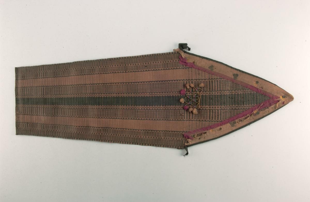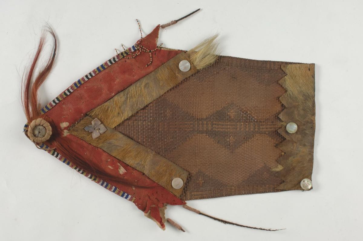 This is a seat or tail mat and was usually made of rattan, plaited in patterns of black and yellow. Animal skin was sometimes added to provide better protection wherever the wearer sat. It has a rectangular shape, with a pointed end, measuring between 50 to 80 centimetres in length and about 30 centimetres wide. It was attached to the back of the loincloth. Seat mats were also made for ceremonial occasions and these ones were usually adorned with beads, cowrie shells, bones and feathers.