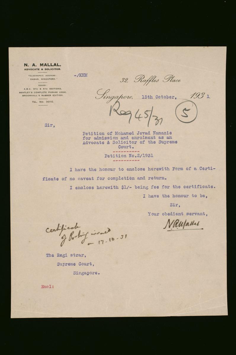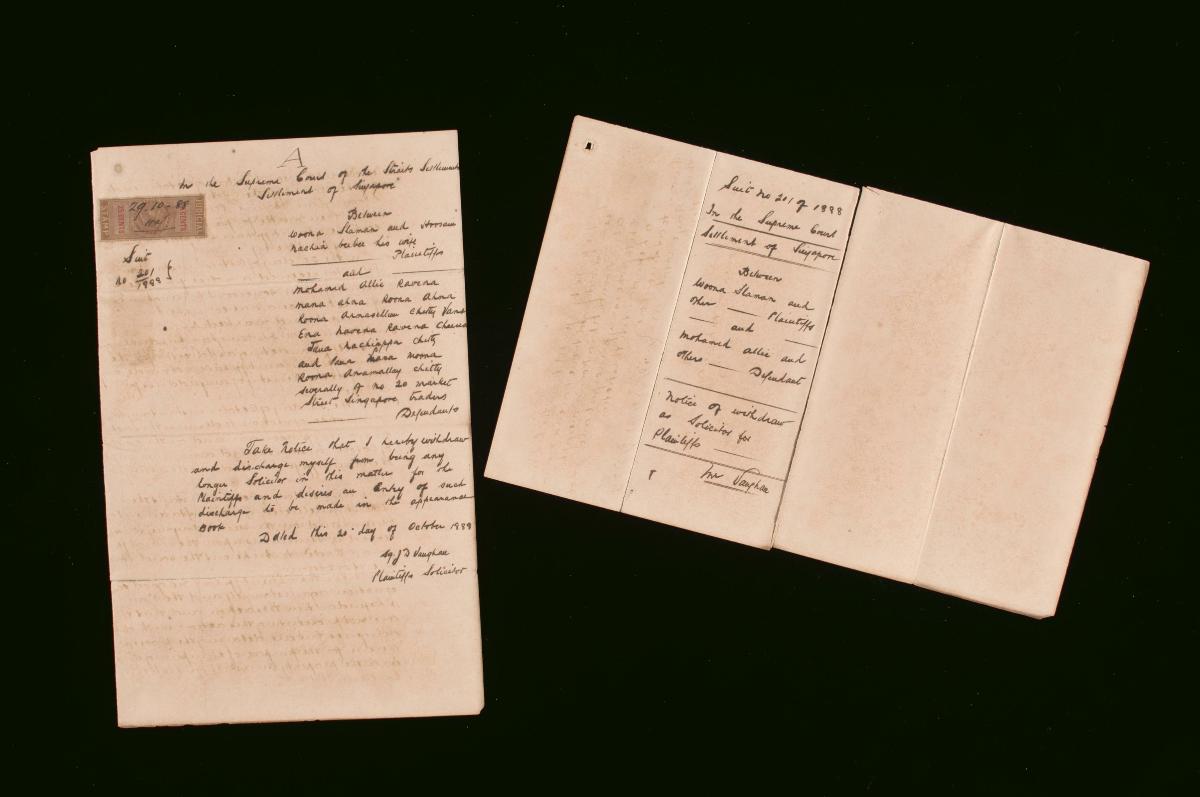 This is the cover page of a notice concerning Mohamed Javad Namazie dated 9 March 1931. It is part of a collection of legal documents from the 19th and early 20th centuries which provides a glimpse into the work of the notable personalities who left their mark on Singapore’s legal history, and the economic and other transactions undertaken by ordinary immigrants in 19th century Singapore that tell stories of misfortune and indebtedness which would otherwise have disappeared from history.