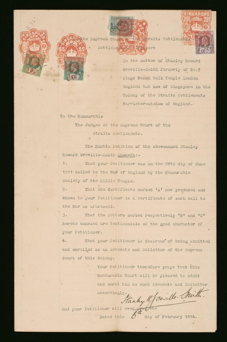 This is the petition of Gilbert Angus and Edward Maher Smith for the probate of the last will and testament of William Charles Leisk. The letters of administration for the will of the deceased were granted to the petitioners on 12 May 1868 by the Supreme Court of the Straits Settlements in Singapore. It is part of a collection of legal documents from the 19th and early 20th centuries which provides a glimpse into the work of the notable personalities who left their mark on Singapore’s legal history, and the economic and other transactions undertaken by ordinary immigrants in 19th century Singapore that tell stories of misfortune and indebtedness which would otherwise have disappeared from history.