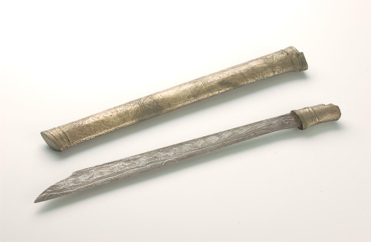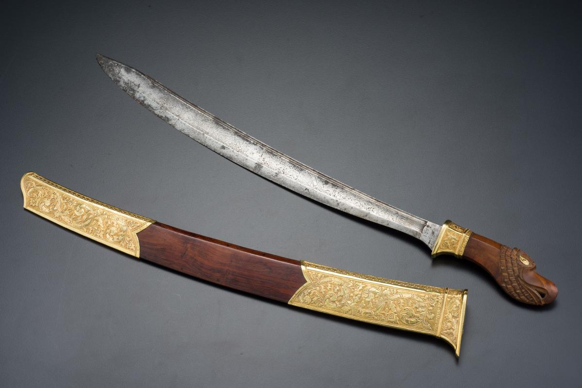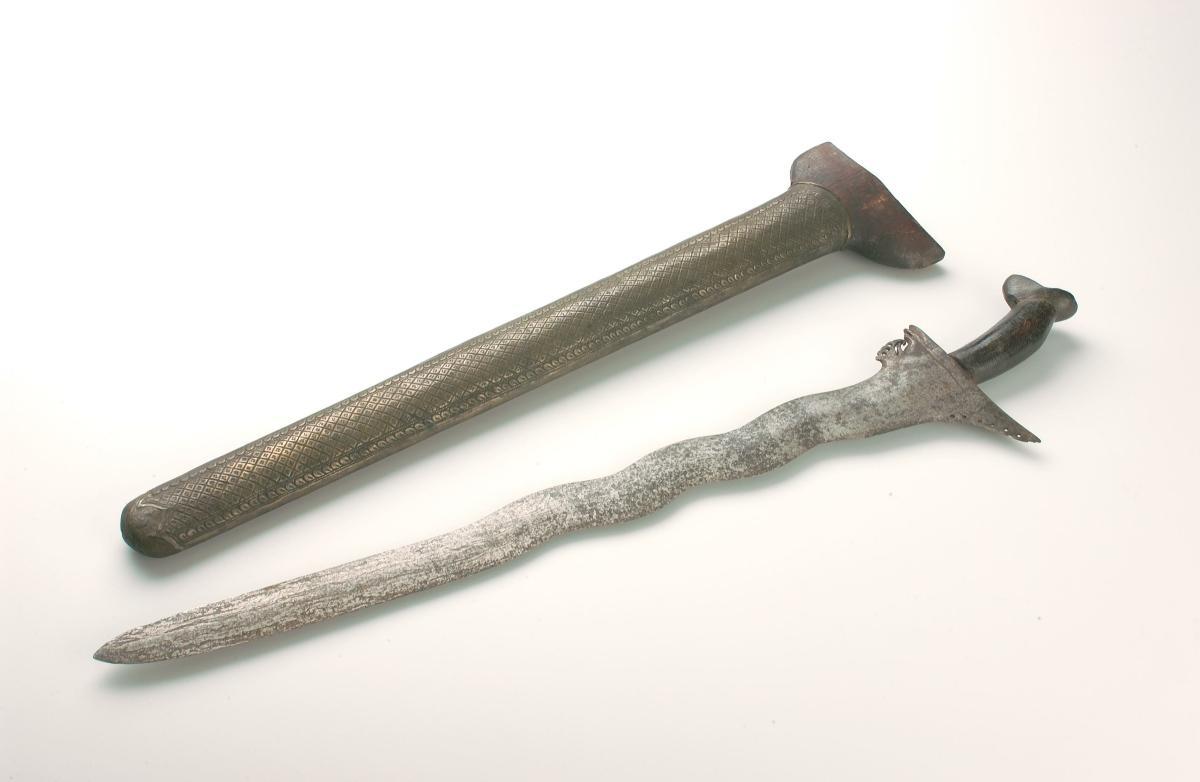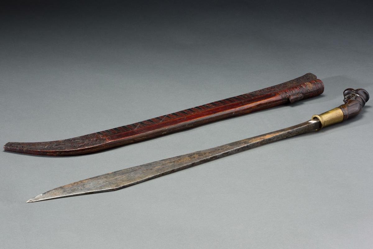 The kampilan is a massive two-handed sword usually found without a sheath. However, the blade could be wrapped with a sheet of bark or a simple sheath made of two pieces of wood and bound with a thin natural fibre string or rattan lashing which allows the scabbard to be cut through easily and the weapon be drawn more quickly. The hilt is usually forked and may have been thought as representing the opened jaws of a crocodile or the tail of the swiftlet. The red lashing may have been used to bind the hand of the wielder to prevent slippage or attached for decorative or talismanic purposes.