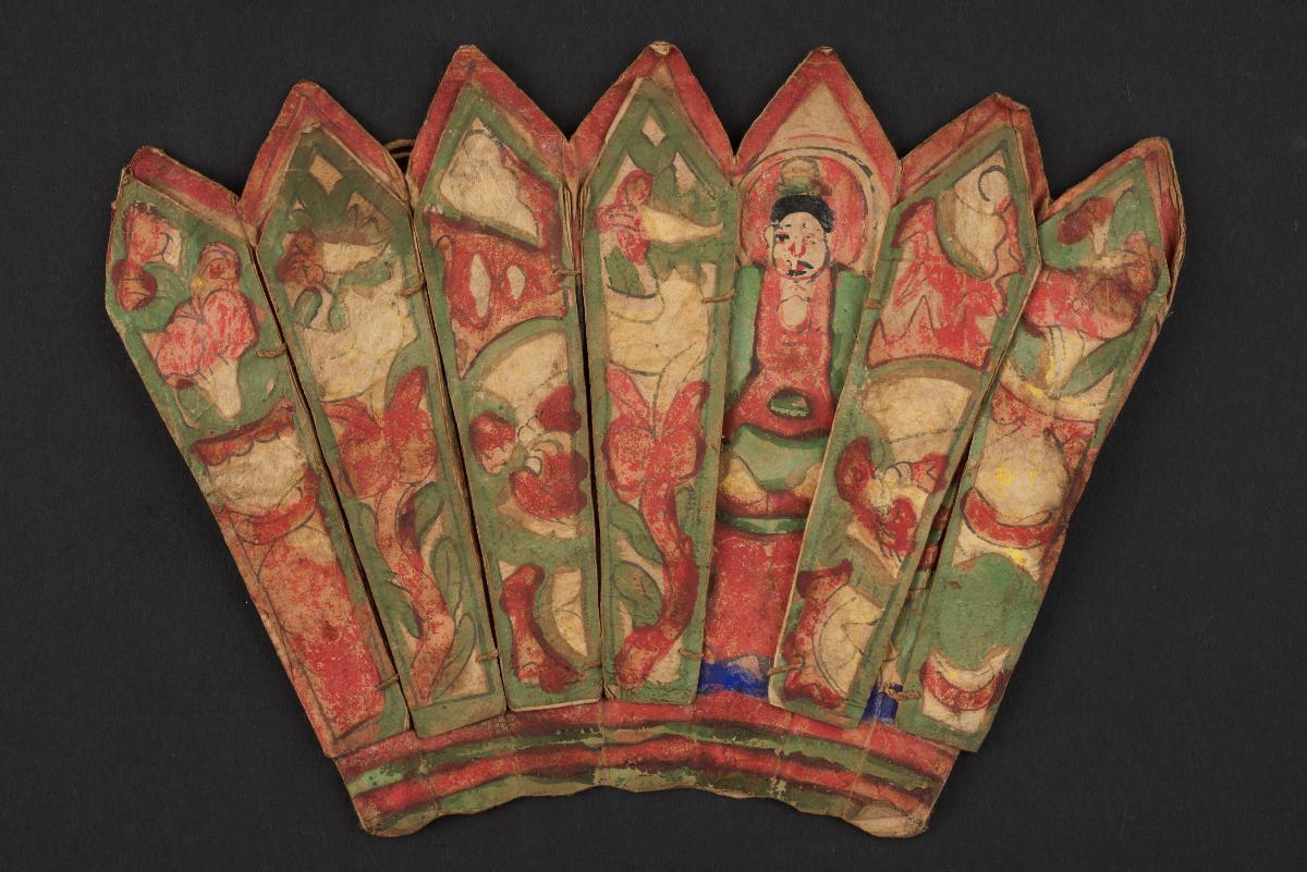 This hat was made by weaving and stitching this strips of cotton cloth over a rattan or fibre frame and decorated with a tiered gilded silver finial. Such hats may have been originally brought by Yemeni traders or brought back by pilgrims from Sumatra who went to Mecca to perform the Hajj. Often, decorative finial of precious metal, set with stones was added, probably as an embellishment to show rank and status. It is a good example of how imported goods were often adopted for ceremonial use by local peoples in Sumatra.