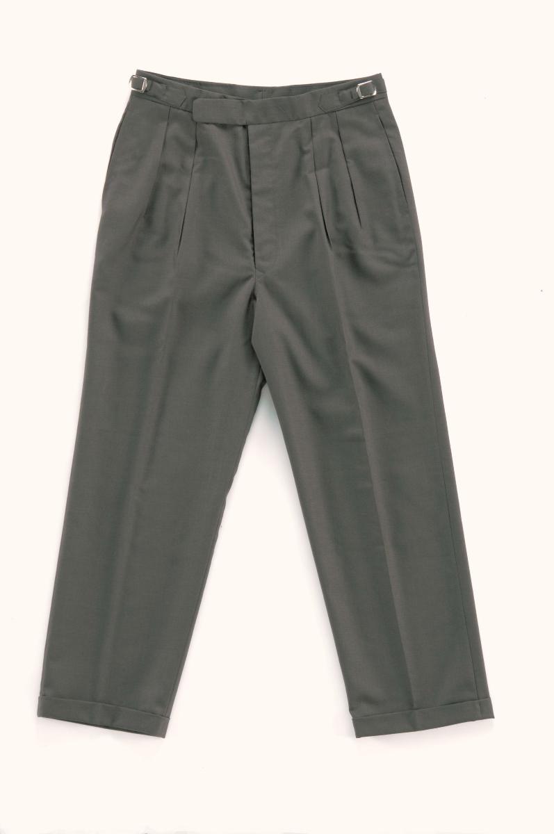 This pair of green-coloured pants has wide pant legs and an adjustable waist. The hems of the pants are cuffed, and the waist area is pleated. It features fly buttons instead of a zipper, reflecting the style of men’s pants in the mid 20th century. The pants are also tailored with pockets at the side.