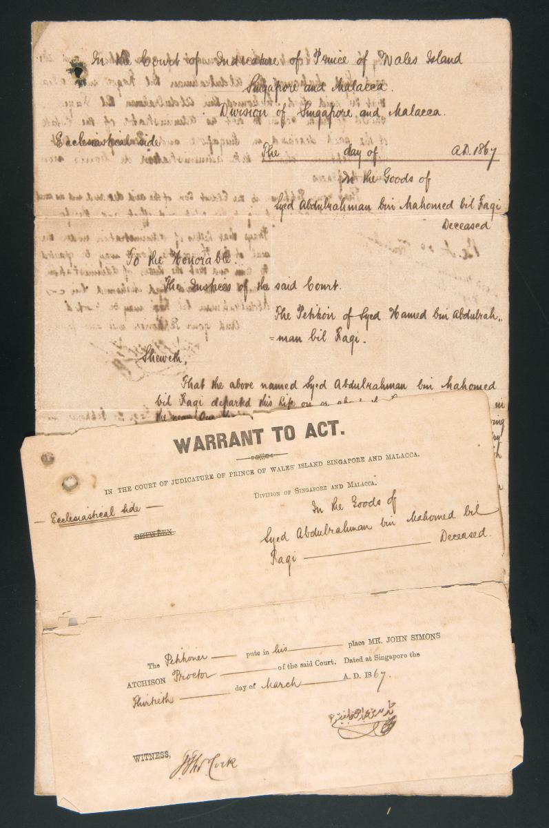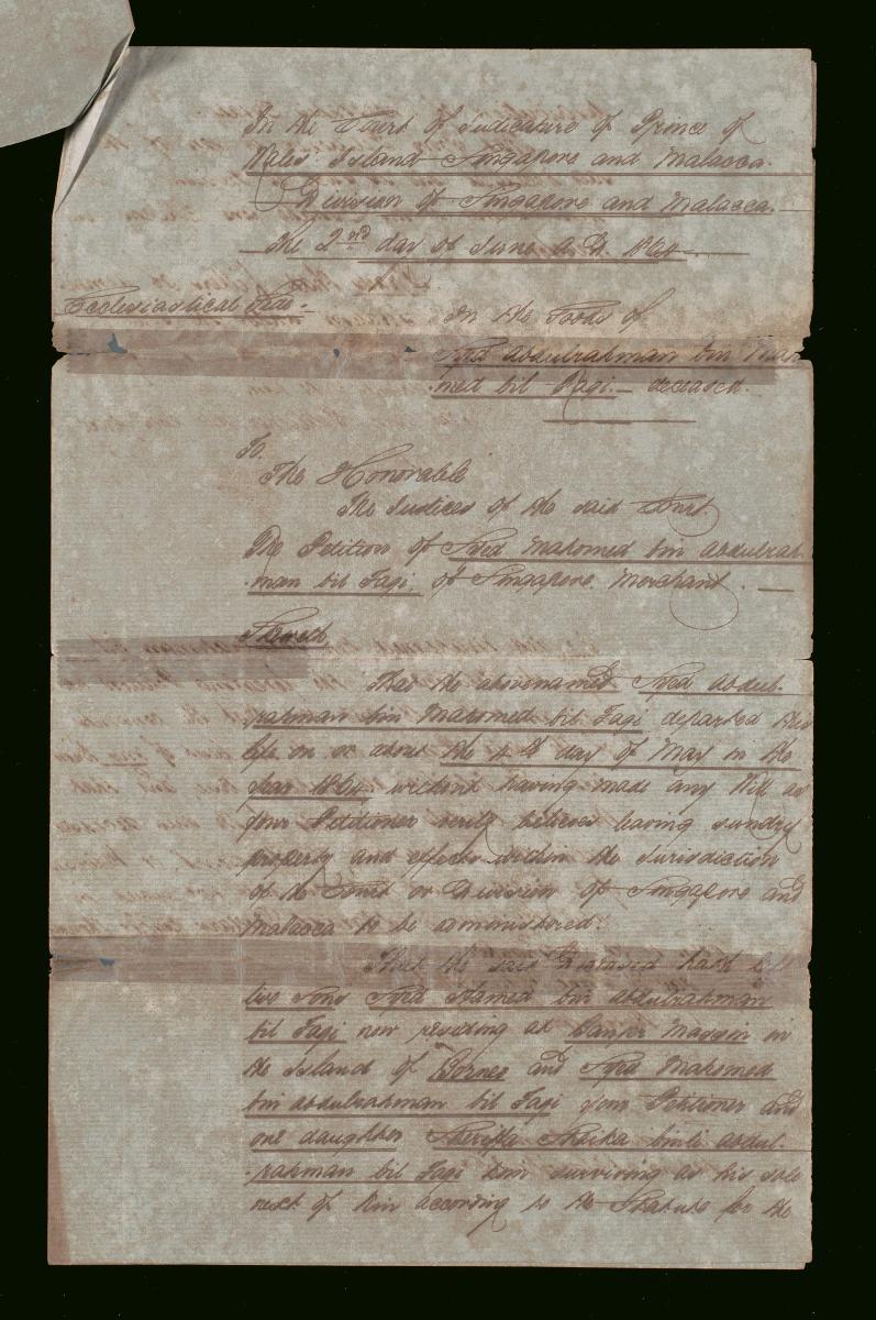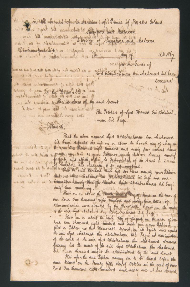 This is the petition of Abdulrahman concerning the administration of the estate of the deceased Kader Bucas filed on 1 May 1876. It is part of a collection of legal documents from the 19th and early 20th centuries which provides a glimpse into the work of the notable personalities who left their mark on Singapore’s legal history, and the economic and other transactions undertaken by ordinary immigrants in 19th century Singapore that tell stories of misfortune and indebtedness which would otherwise have disappeared from history.