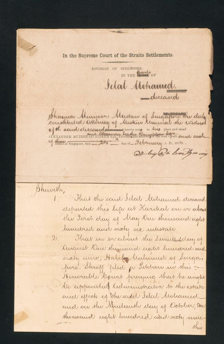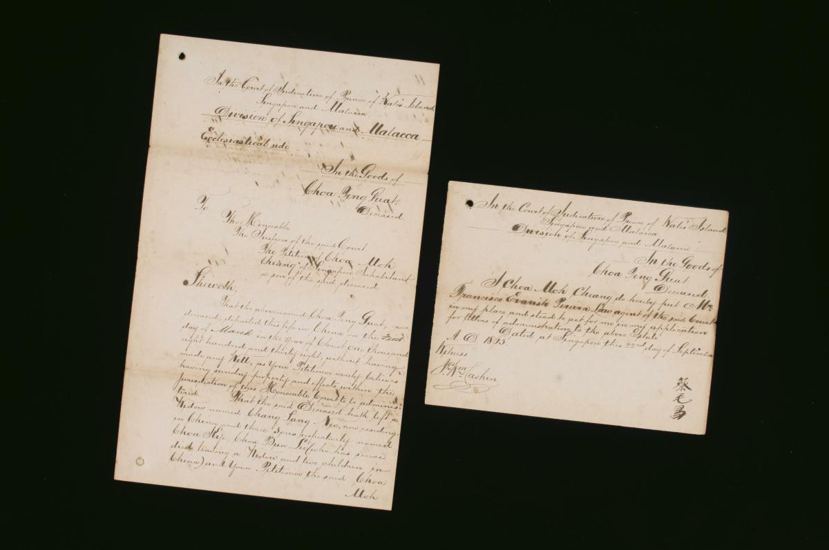 These are the warrant to act and the petition issued by Chea Toh concerning the administration of the estate of Chew Chew Ho. They are part of a collection of legal documents from the 19th and early 20th centuries which provides a glimpse into the work of the notable personalities who left their mark on Singapore’s legal history, and the economic and other transactions undertaken by ordinary immigrants in 19th century Singapore that tell stories of misfortune and indebtedness which would otherwise have disappeared from history.