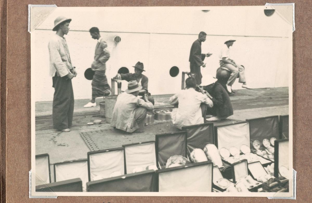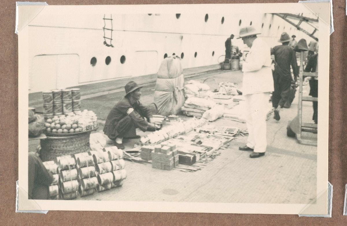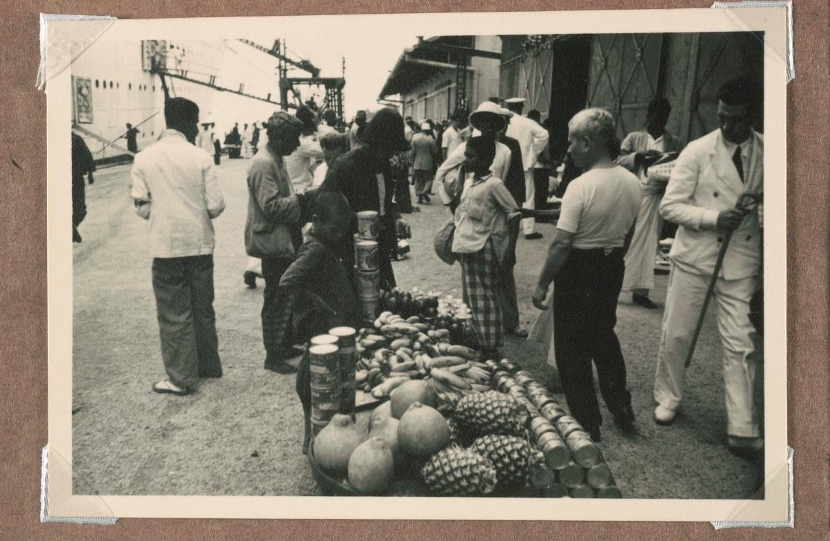 This photograph shows street vendors selling their goods to boats that have docked at the ports in Singapore. These vendors operated similarly with ‘five-foot-way’ traders who could be seen conducting their businesses along shophouse walkways that were five feet wide. These traders were immigrants of various races who were often found in areas such as Chinatown where they peddled their wares.
