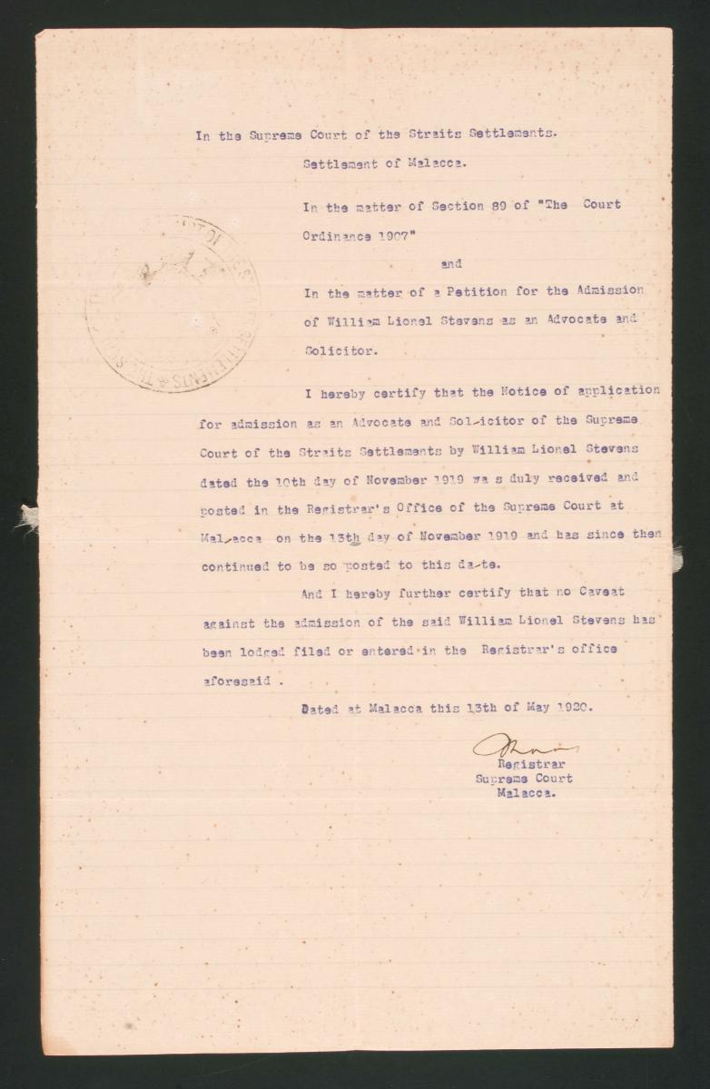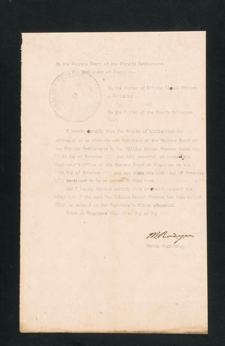 This is a registrar's certificate issued on 14 May 1920 by the Registrar of the Supreme Court of the Straits Settlements in Penang for William Lionel Stevens. It is part of a collection of legal documents from the 19th and early 20th centuries which provides a glimpse into the work of the notable personalities who left their mark on Singapore’s legal history, and the economic and other transactions undertaken by ordinary immigrants in 19th century Singapore that tell stories of misfortune and indebtedness which would otherwise have disappeared from history.