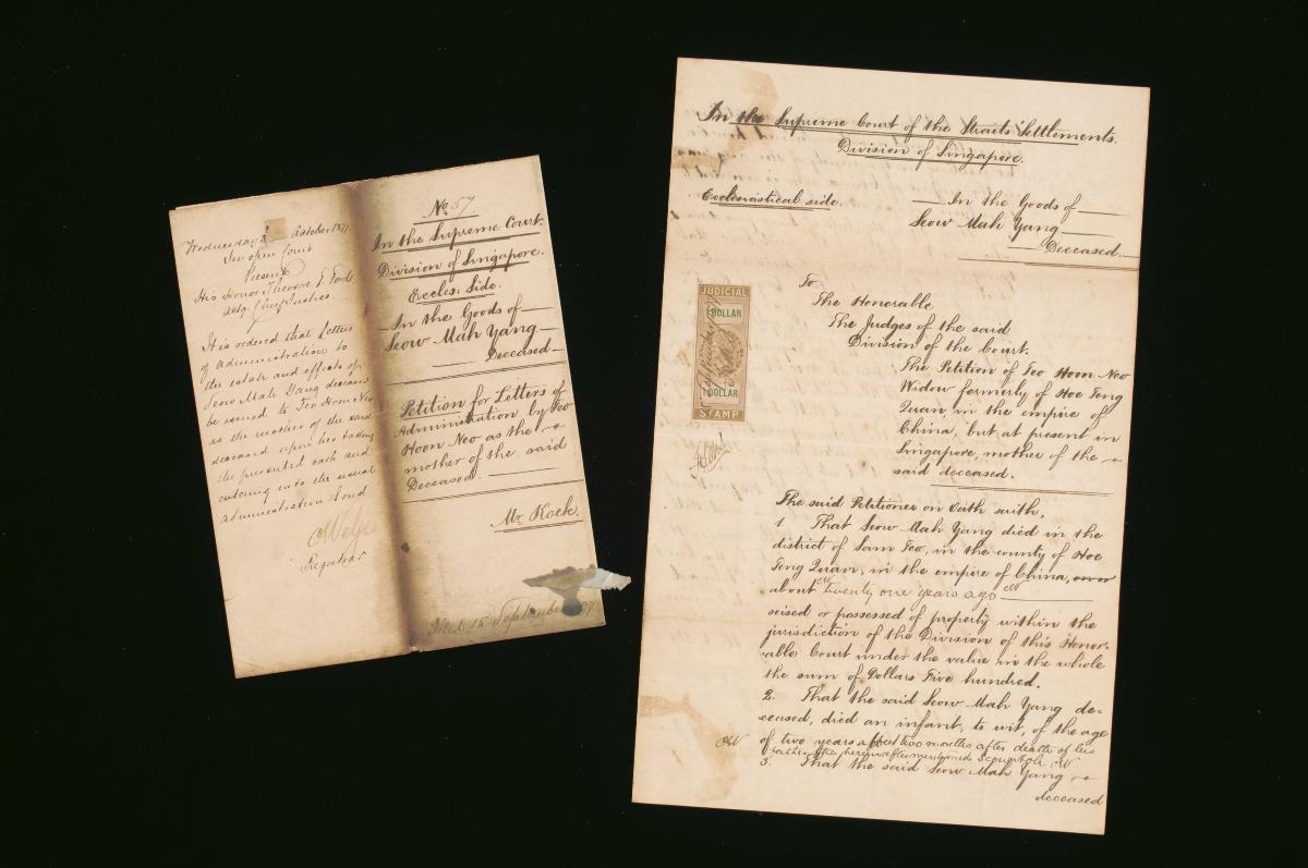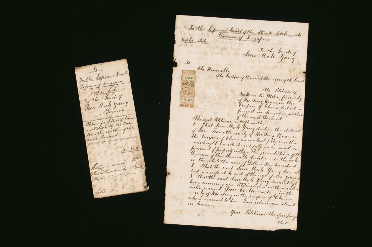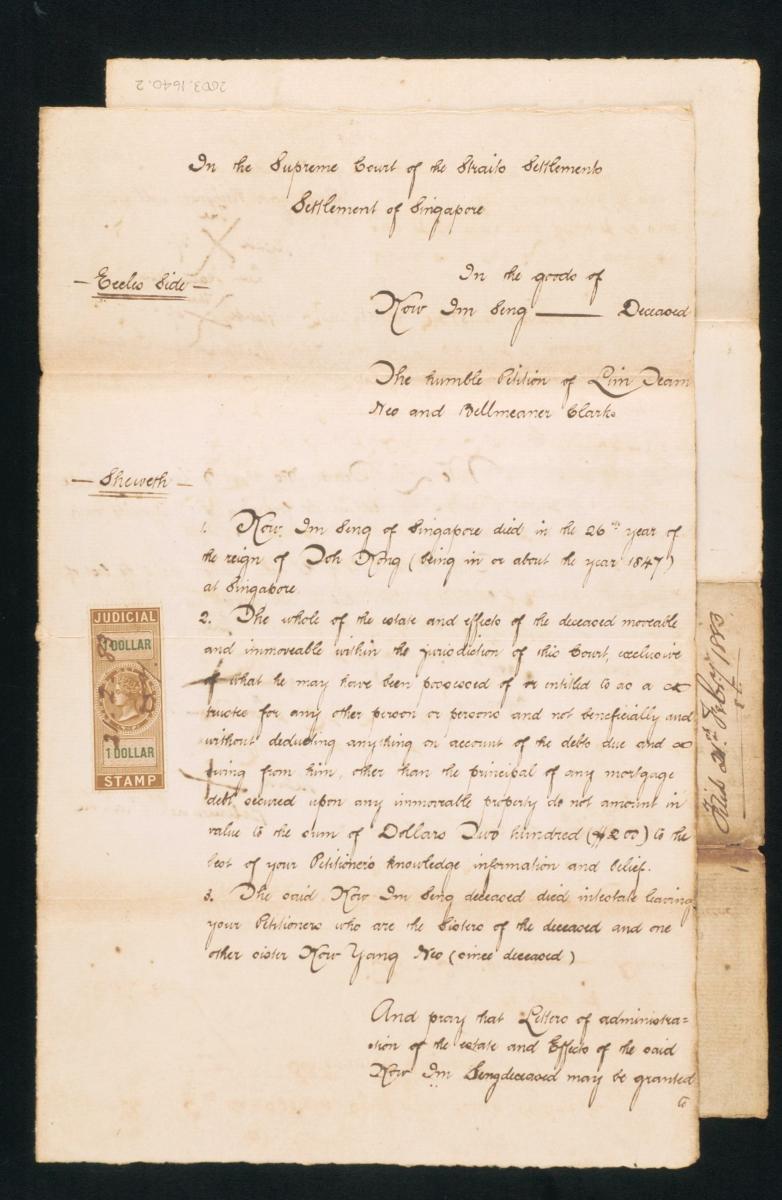 This is the petition of Neo Team Wat filed on 11 October 1855 concerning the administration of the estate of the deceased Neo Team Lok. The petitioner was subsequently granted the letters of administration for the estate on 12 November 1855. This document is part of a collection of legal documents from the 19th and early 20th centuries which provides a glimpse into the work of the notable personalities who left their mark on Singapore’s legal history, and the economic and other transactions undertaken by ordinary immigrants in 19th century Singapore that tell stories of misfortune and indebtedness which would otherwise have disappeared from history.