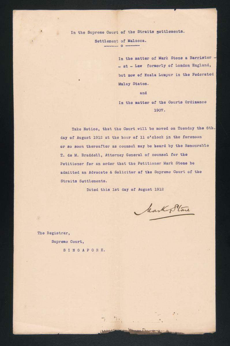 This is the petition of Mark Stone filed on 29 January 1912 for his admission as a solicitor and advocate to the Supreme Court of the Straits Settlements. It is part of a collection of legal documents from the 19th and early 20th centuries which provides a glimpse into the work of the notable personalities who left their mark on Singapore’s legal history, and the economic and other transactions undertaken by ordinary immigrants in 19th century Singapore that tell stories of misfortune and indebtedness which would otherwise have disappeared from history.