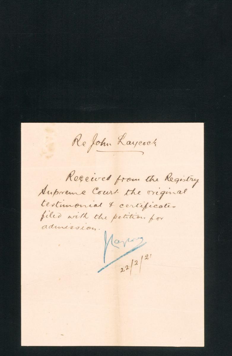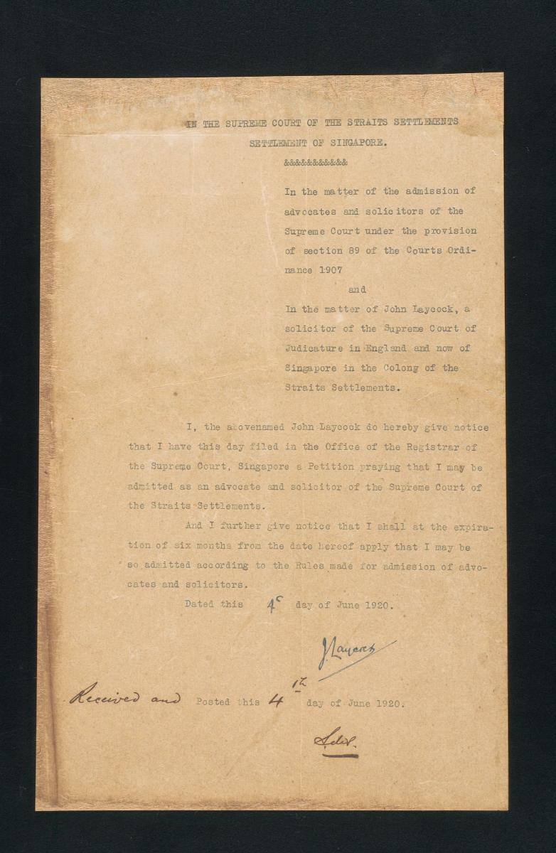 This is the petition of John Laycock for his admission as a solicitor and advocate to the Supreme Court of the Straits Settlements. It is part of a collection of legal documents from the 19th and early 20th centuries which provides a glimpse into the work of the notable personalities who left their mark on Singapore’s legal history, and the economic and other transactions undertaken by ordinary immigrants in 19th century Singapore that tell stories of misfortune and indebtedness which would otherwise have disappeared from history.