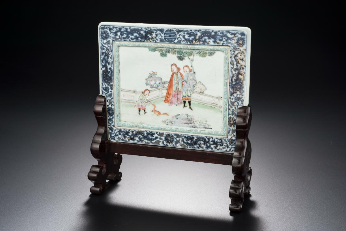 This squarish marble screen has a carved heavy rosewood frame. The marble has a dramatic cloud swirl motif and an inscription on the right hand corner. It is an object for appreciation in the scholar’s studio, usually placed on the table or on a high table against the wall for decoration.