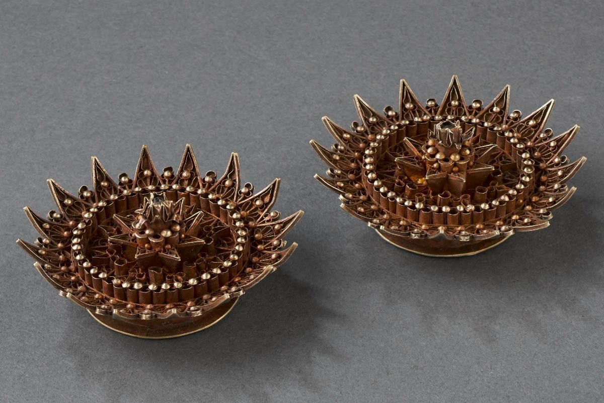 This display of disk-shaped ornaments highlights the ingenuity of Southeast Asian communities, as they encountered and absorbed a variety of cultural ideas through the long ebb and flow of their history. The beaten gold dishes and plates of Southeast Maluku boldly display emblems of beasts, plants and divine human figures. Communities that had adopted Islam, like the Bugis of South Sulawesi, however, softened these into stylised abstractions. New techniques of filigree, red staining and granulation lent a new intricacy to their ornaments.