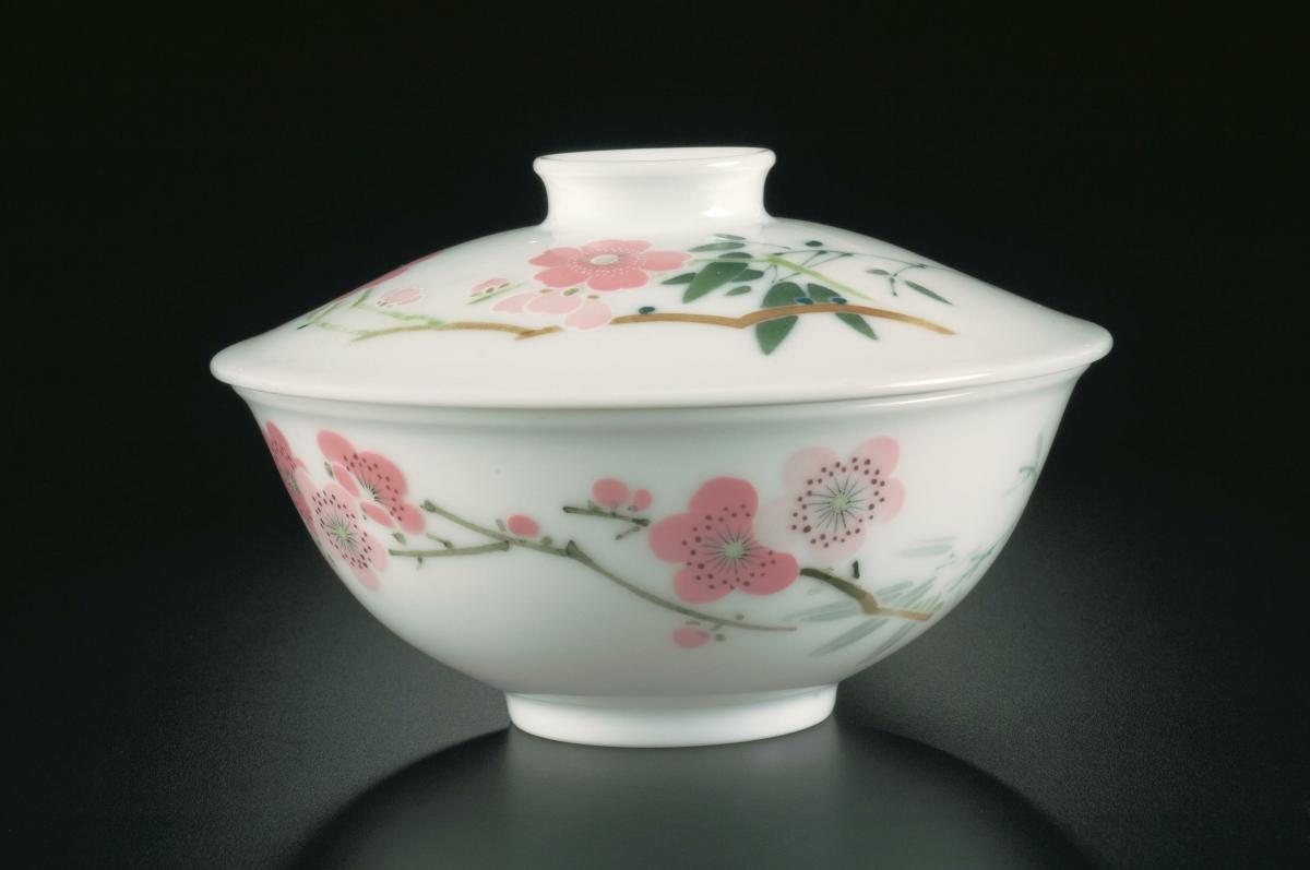 This type of pure white, reproduction porcelain bowl was the type of ware made for Mao Ze Dong during the Cultural Revolution.It is decorated with an overglazed plum blossom design. Other items in the set include bowls, tea spoons, dishes, ashtrays, vases and other decorative pieces.The plum blossom motif has been popular in Chinese art for centuries. Regarded as a symbol of endurance, it has come to signify the communists’ perseverance in the revolutionary struggle.