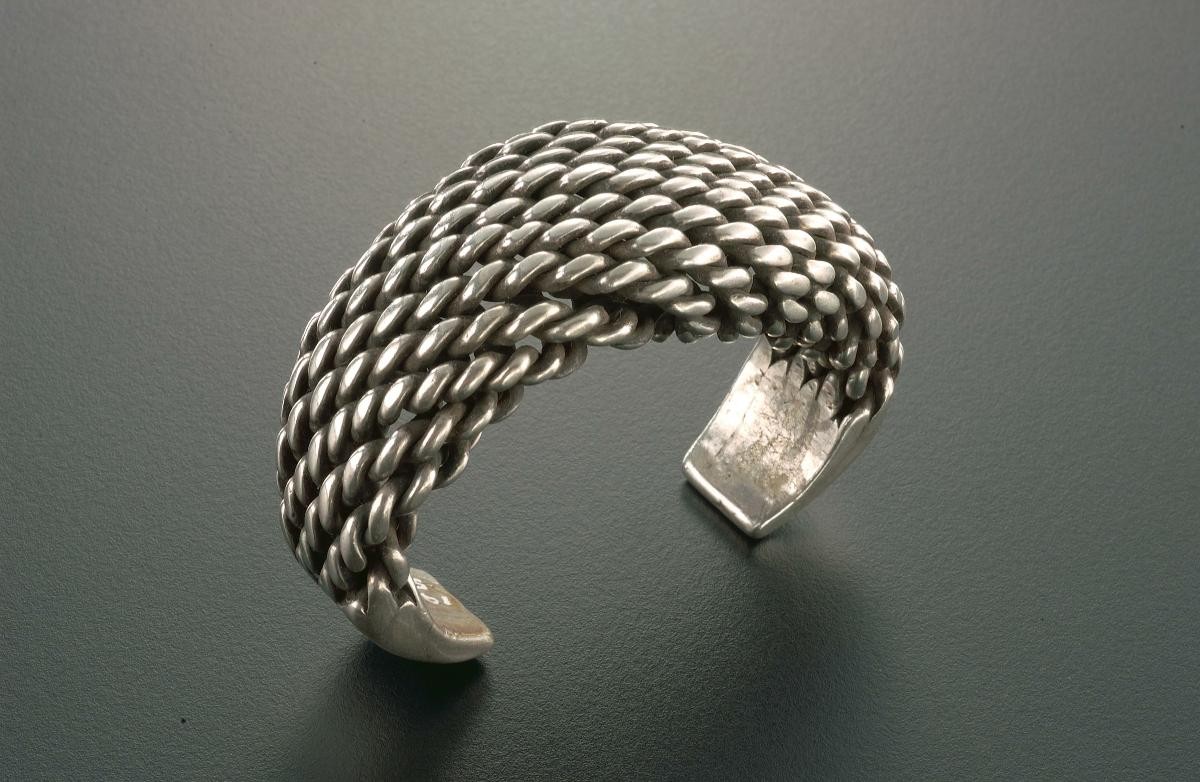 This bracelet represents a fraction of the wide repertoire of silver jewellery made, worn and exchanged by highland communities in northern Thailand. Several types of bracelets with coiled, plaited and twisted forms were worn. This type was worn by Akha women in particular.Silver was valued more highly than gold by many highland communities. Silver jewellery was a way of investing a family’s wealth to be passed down as heirlooms. It was also believed to have protective properties. Today, where security maybe a problem, silver is kept locked away while aluminium is used as a substitute.Originally, highlanders from China, the Akha people have recently begun to move southwards into mainland Southeast Asia.