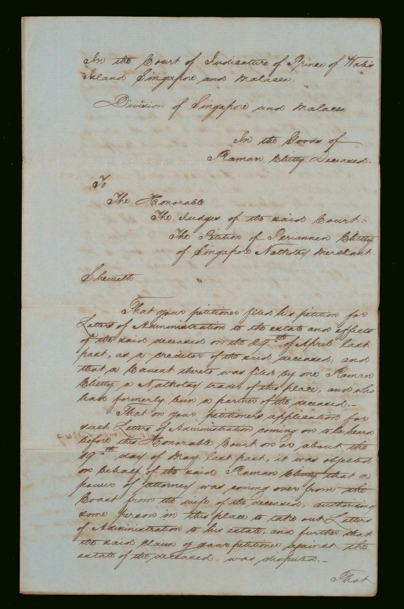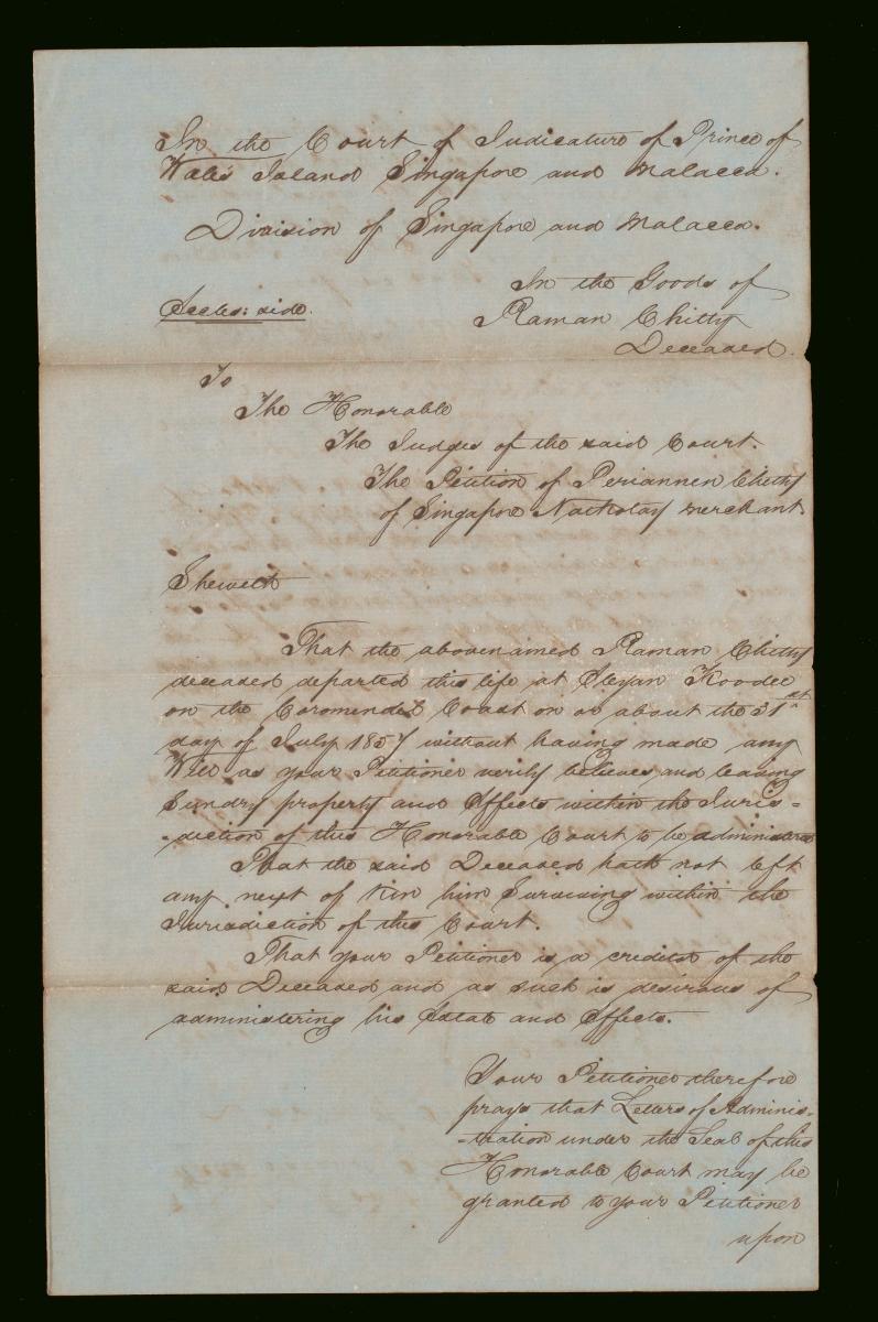 This is the petition of Ahma Lana Nana Raman Chitty of Singapore concerning the administration of the estate of the deceased Ahma Lana Nana Palaniappa Chitty. It is part of a collection of legal documents from the 19th and early 20th centuries which provides a glimpse into the work of the notable personalities who left their mark on Singapore’s legal history, and the economic and other transactions undertaken by ordinary immigrants in 19th century Singapore that tell stories of misfortune and indebtedness which would otherwise have disappeared from history.