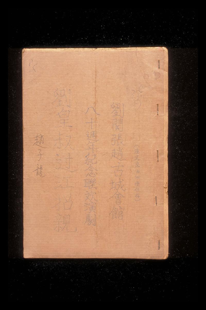 This handwritten opera script and titles tablet belonged to Sin Teck Gerk, a Henghwa (Xinghua) string puppet troupe established around the 1920s. The titles tablet has two wooden blocks enclosing 21 folded sides, on which the titles of 44 plays are listed. The play to be performed was “decided” by the temple deity, through a ritual involving a pair of kidney-shaped divining blocks.