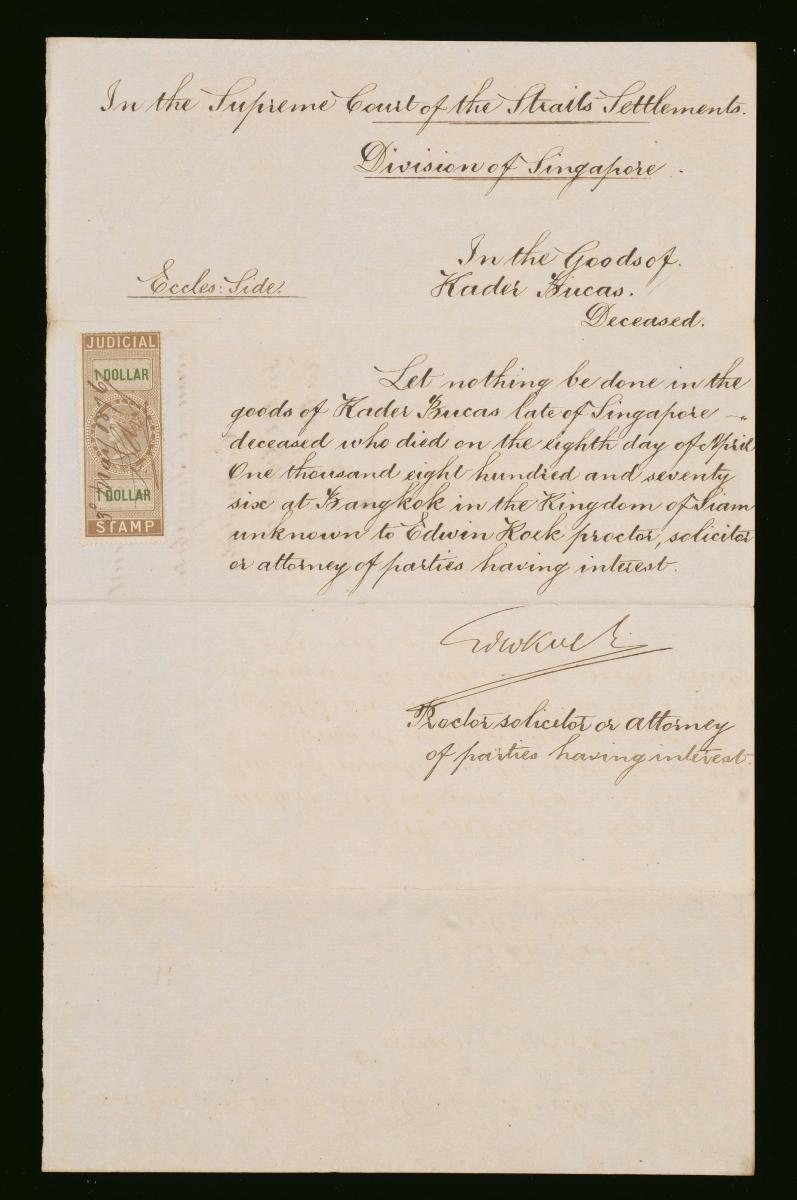 This is a set of documents concerning the administration of the estate of Kader Bucas. It is part of a collection of legal documents from the 19th and early 20th centuries which provides a glimpse into the work of the notable personalities who left their mark on Singapore’s legal history, and the economic and other transactions undertaken by ordinary immigrants in 19th century Singapore that tell stories of misfortune and indebtedness which would otherwise have disappeared from history.