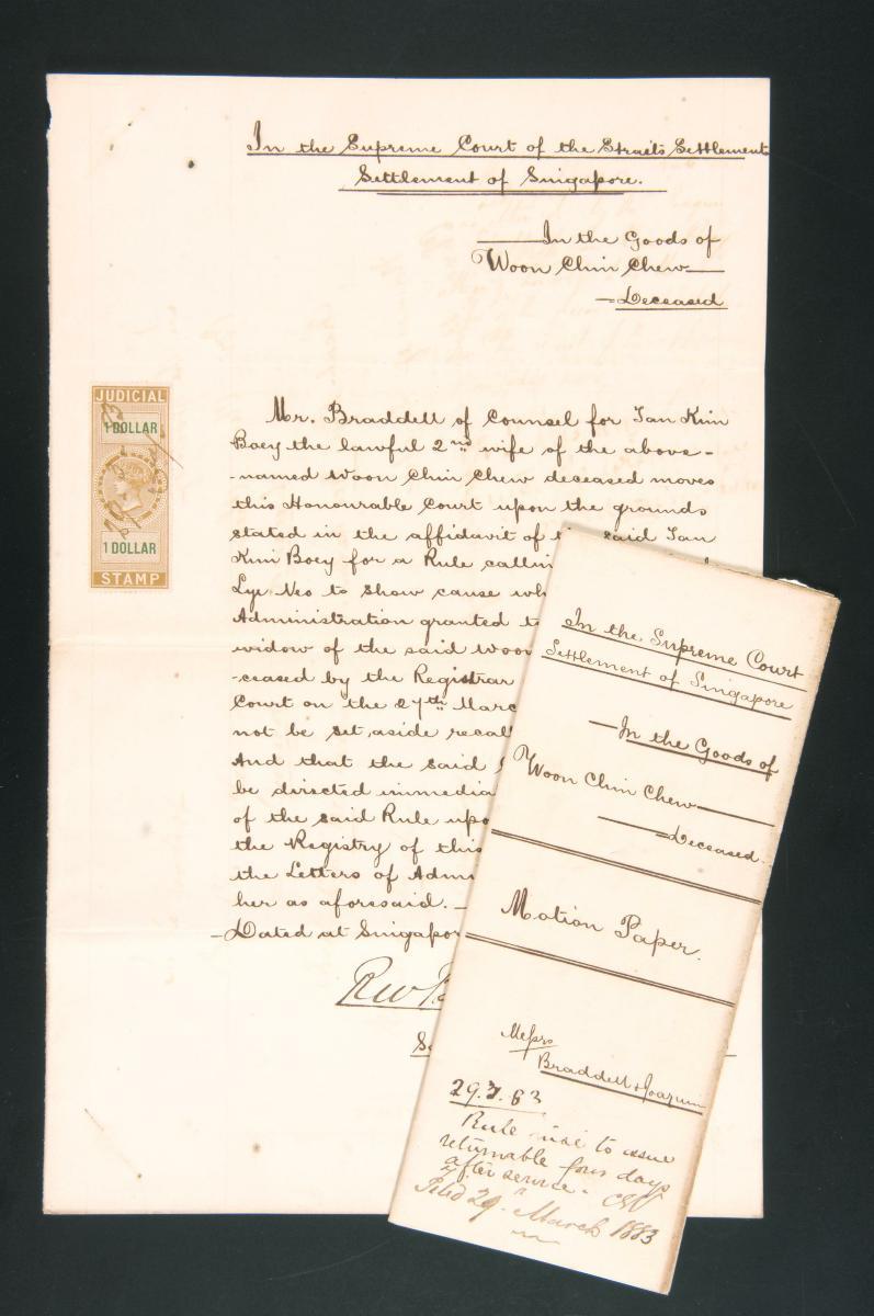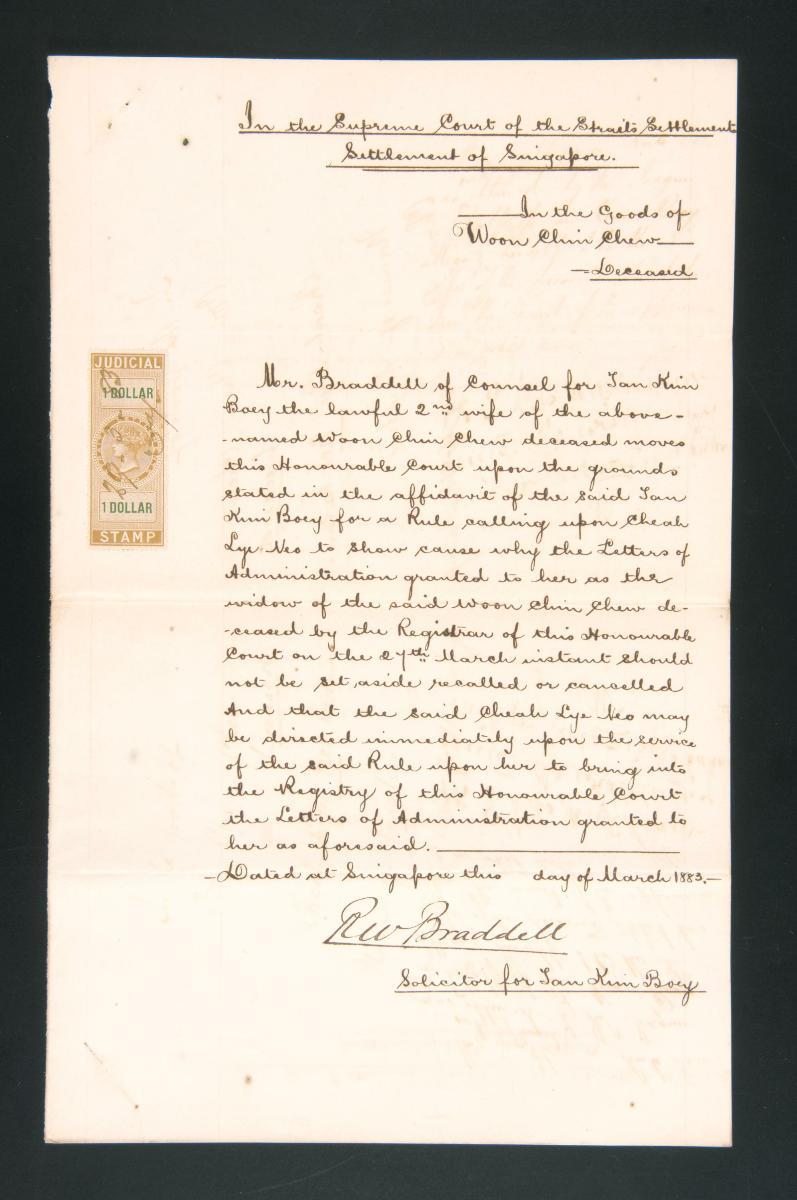 This is the affidavit of Tan Kim Boey made on 29 March 1883 concerning the administration of the estate of Woon Chin Chew. It is part of a collection of legal documents from the 19th and early 20th centuries which provides a glimpse into the work of the notable personalities who left their mark on Singapore’s legal history, and the economic and other transactions undertaken by ordinary immigrants in 19th century Singapore that tell stories of misfortune and indebtedness which would otherwise have disappeared from history.